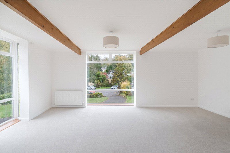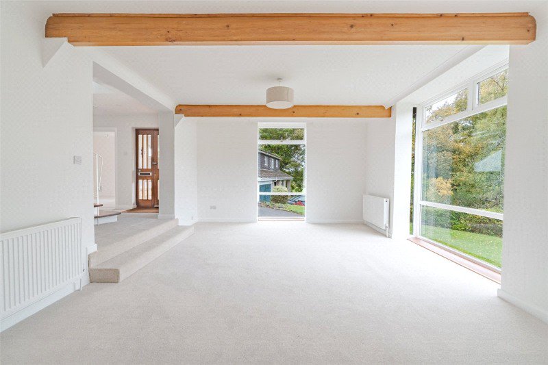 3 steps (with wrought iron balustrades) lead to a covered verandah, from which the front door opens onto a large central reception hall with an impressive, curved staircase, a shelved recess and fitted cupboards. A large open plan walkway and step down lead to a spacious, dual aspect living room with 2 feature ceiling beams, and 2 full height picture windows offering an attractive outlook to the front and side, perfect for entertaining.