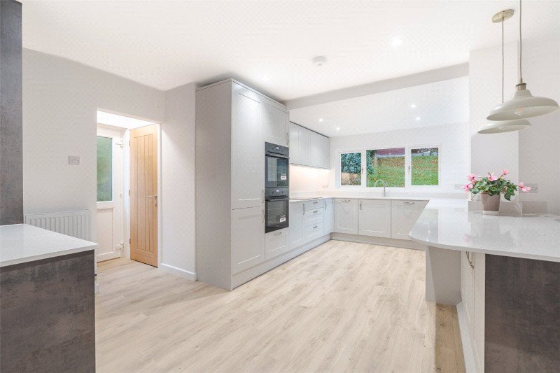 Running from front to rear is a separate large, dual aspect family/dining room with a patio door to the rear garden terrace. This L-shaped room flows into a newly fitted, contemporary style kitchen/breakfast room which overlooks the rear garden and features an excellent range of units (including a peninsular breakfast bar unit and a large retractable larder), quartz worktops, Amtico flooring, Quooker tap and integrated appliances comprising fridge-freezer, AEG electric double oven, induction hob, extractor, dishwasher and washing machine.