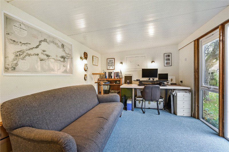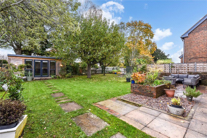 The rear garden is a true sanctuary — beautifully landscaped and exceptionally private, with a paved terrace for dining and entertaining, a lush lawn bordered by mature trees, and a peaceful seating area surrounded by seasonal planting. At the far end sits a contemporary timber-clad garden studio with full-height glazed doors, offering an inspiring space for home working, creativity, or guest accommodation. This exceptional family home delivers the perfect balance of elegance, functionality, and tranquillity.