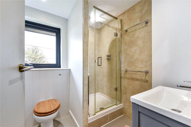 Upstairs, the principal bedroom serves as a serene retreat, elegantly decorated in soft neutral tones and featuring a large window with a tranquil outlook over the fields beyond, offering a calm and restful atmosphere. Fitted wardrobes provide ample storage, while the en-suite shower room is finished to a luxurious standard with limestone-style tiling, a rainfall shower, and chrome fittings. The second bedroom is a generous double, currently arranged as a charming children’s room — bright and airy, with playful decorative touches. The third bedroom is a comfortable double with views over the fields, while the fourth bedroom overlooks the garden and is similarly well-proportioned, featuring leafy treetop views and versatile space ideal for teenagers or guests. Each room maintains the home’s refined, cohesive style, with soft carpeting, warm tones, and abundant natural light.