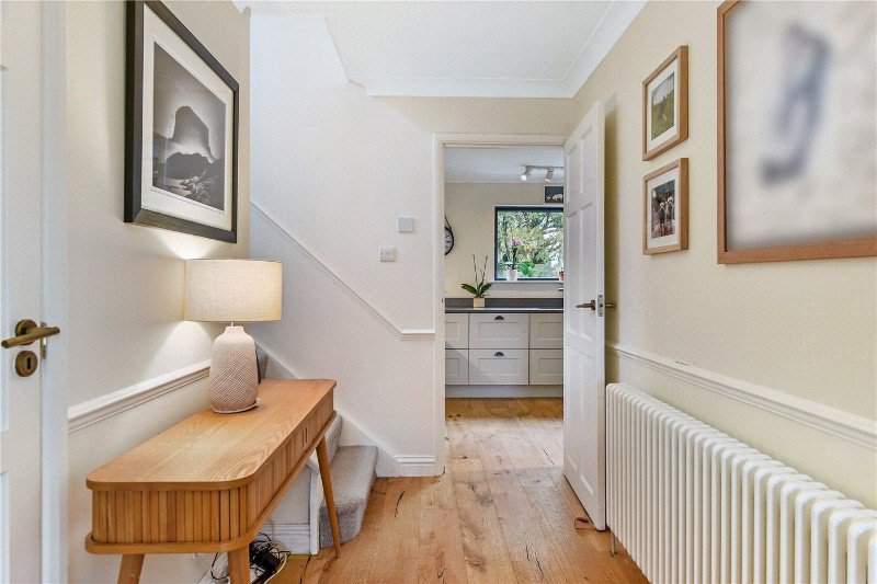 Inside, the bright and welcoming hallway immediately sets the tone for the rest of the home, featuring wide-plank oak flooring, soft neutral walls, and elegant decorative detailing. To the left of the hallway, a convenient downstairs W/C adds practicality for family living. The principal reception room is arranged around a feature fireplace and a large picture window, creating a warm and inviting atmosphere with space for both living and dining areas. The adjoining kitchen is a true highlight — spacious, contemporary, and beautifully finished with light grey cabinetry, quartz worktops, and bi-fold doors that open directly onto the garden terrace, perfect for entertaining or relaxed family life. A well-equipped utility room is conveniently located off the kitchen. A versatile study or playroom completes the ground floor, offering an ideal space for home working or children’s activities.