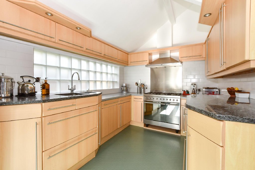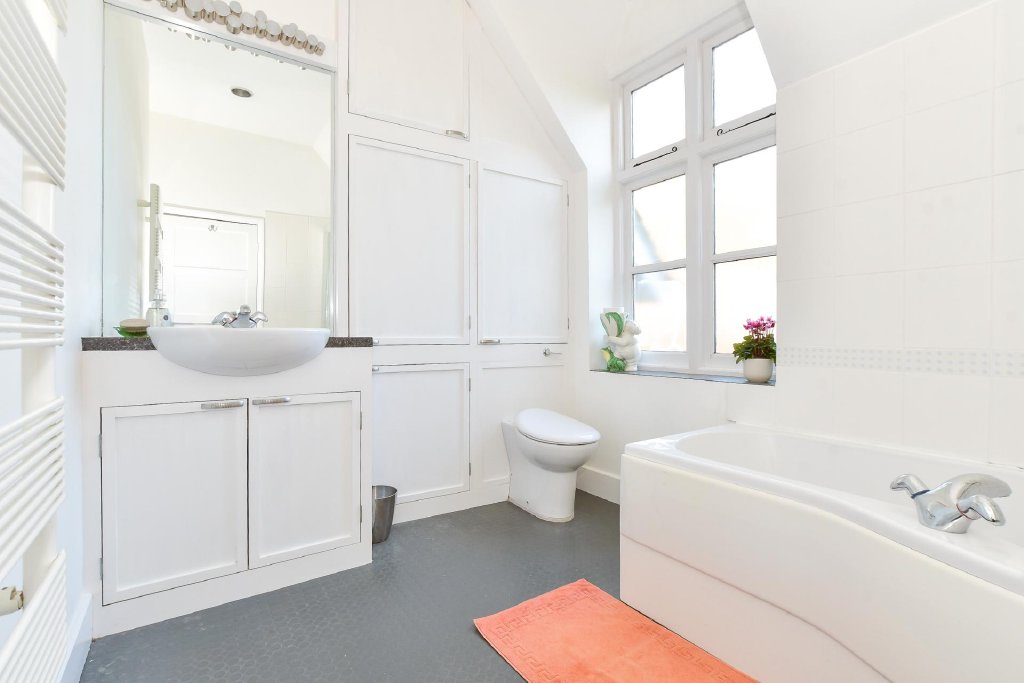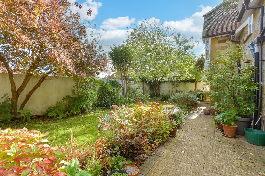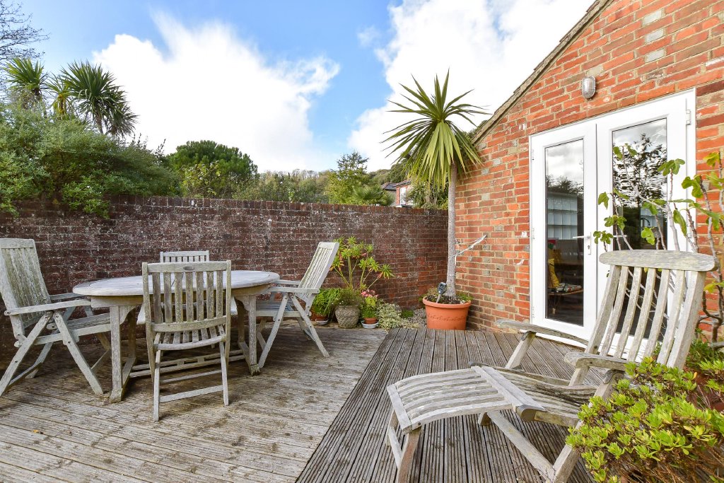 The bright, spacious kitchen is designed for both everyday living and entertaining. Abundant wall and base units offer extensive storage, while the breakfast area enjoys a delightful outlook and opens through French doors to a Mediterranean-style garden. This charming outdoor haven features a large, decked dining terrace leading down to a lawn bordered by mature planting. With a sunny southerly aspect and sweeping views over the English Channel, it’s a perfect setting for alfresco dining and relaxation.