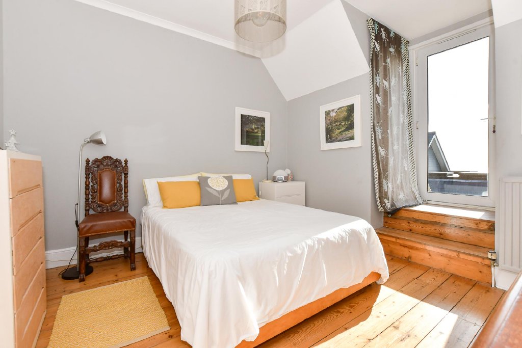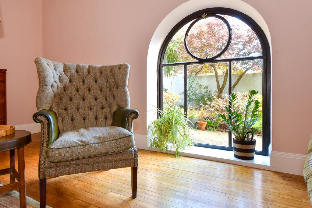 - Spacious living areas with original arched windows and wood burning stove