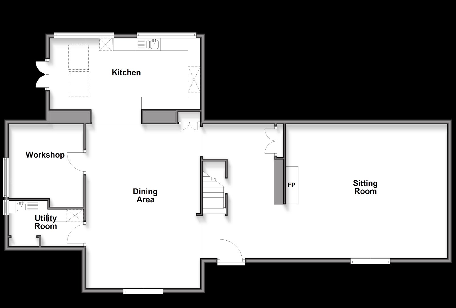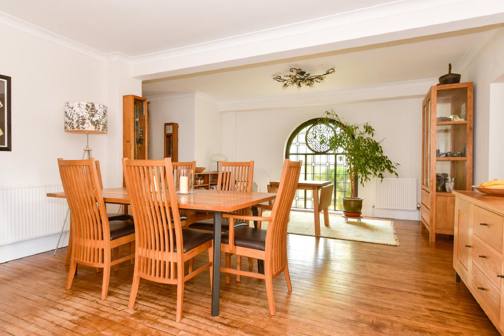 The impressive dining room continues the theme of grandeur, featuring another of the original arched openings now transformed into a beautiful leaded glass window. This elegant space is ideal for entertaining on a large scale or hosting intimate family gatherings. Adjacent to the dining room are two versatile rooms: a practical utility area and a larger room currently used as a workshop, which could easily be reimagined as a home office, creative studio, or playroom.