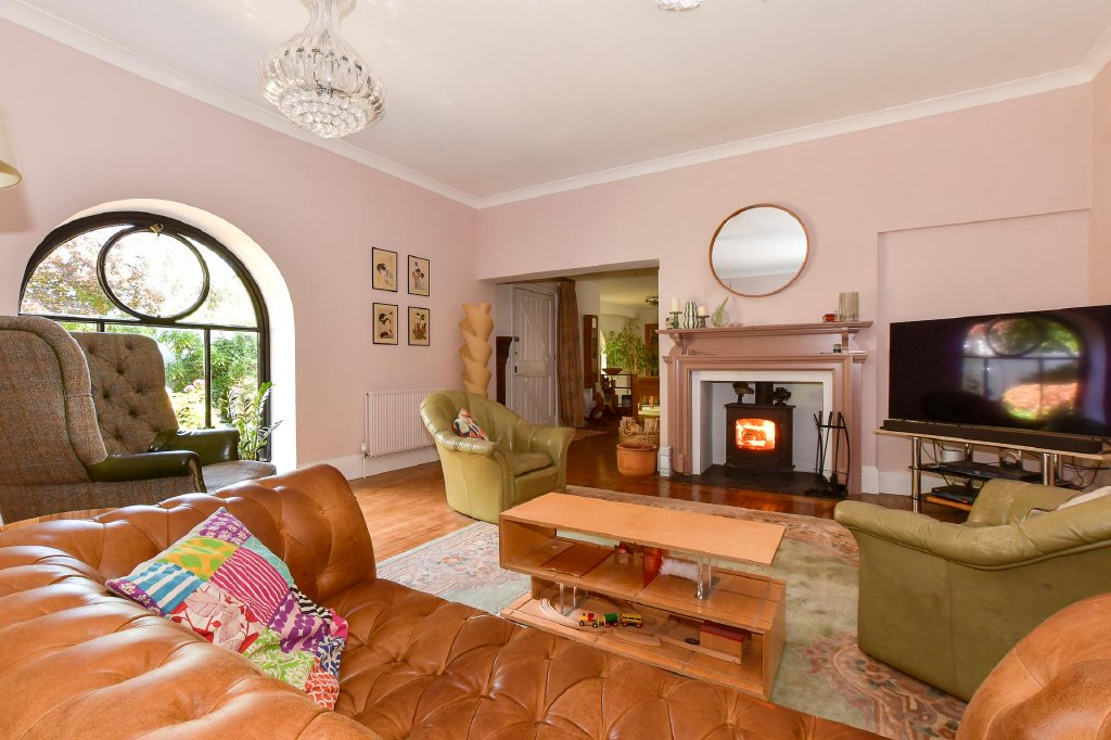 Upon entering, you are greeted by a generous reception hall complete with fitted storage, which flows seamlessly into a substantial sitting room. Here, a stunning floor-to-ceiling arched window floods the space with natural light and provides a striking focal point, complemented by a feature fireplace with a wood-burning stove, perfect for cosy evenings.