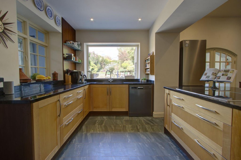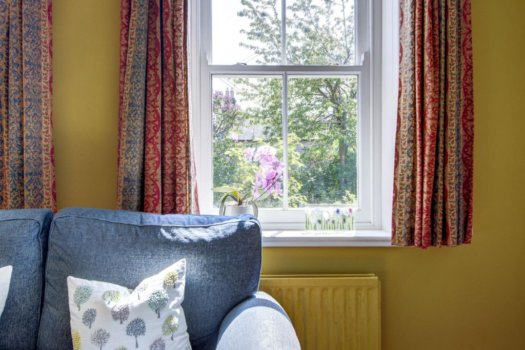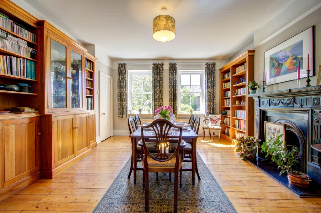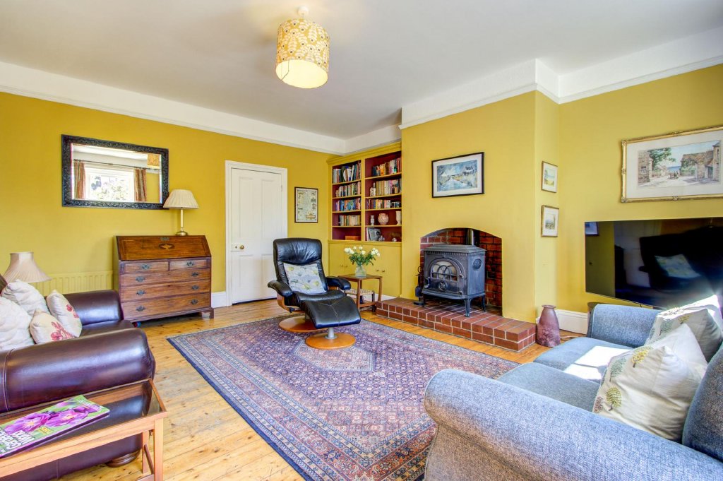 A convenient porch opens into the hallway, which leads to the two main reception rooms. The spacious dining room features a stunning fireplace, fitted bookcases and room for a large dining table, perfect for family get-togethers over Sunday lunch. The beautiful sitting room has wonderful views over the front garden and is the ideal spot to relax and unwind in front of the wood-burning stove.