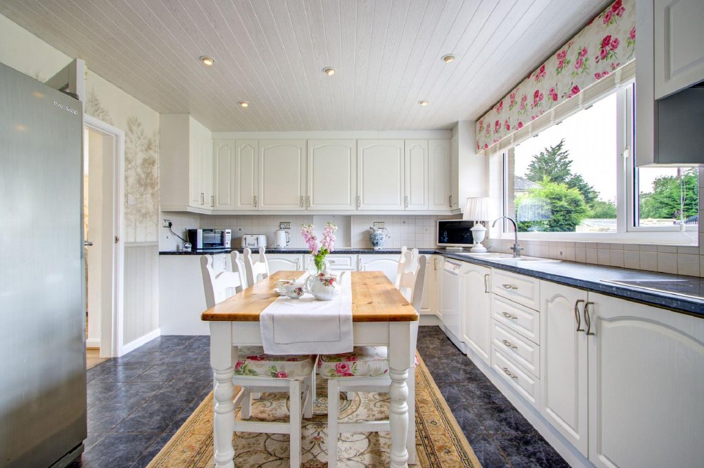 Just off the sitting room, the well-appointed kitchen features integrated appliances and space for a dining table, ideal for casual meals and chats over breakfast.