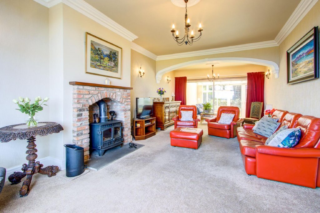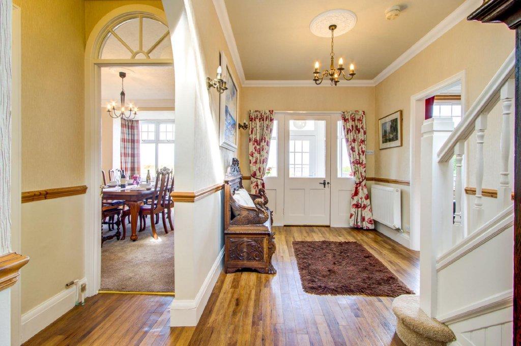 The welcoming hallway leads to two elegant reception rooms, both with remarkable sea views. The dining room, with its feature fireplace, is perfect for entertaining or family gatherings, while the spacious sitting room, with its wood-burning stove, is made for cosy evenings with the ever-changing seascape as your backdrop.