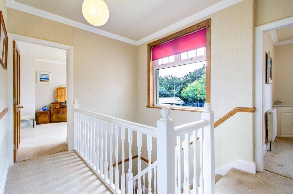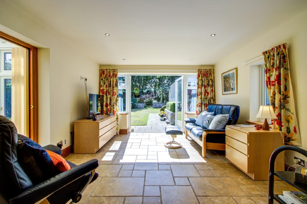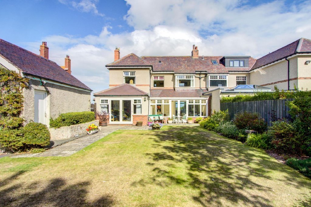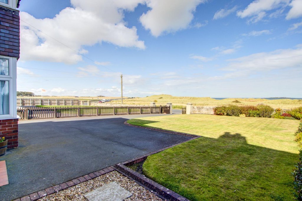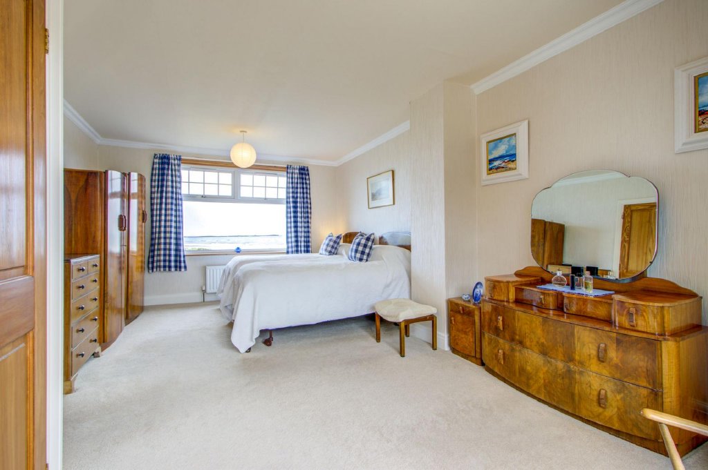 Outside, the generous gardens are an absolute delight. With manicured lawns and pretty borders to the front, and a patio, lawns and mature trees to the rear, this wonderful outdoor space extends to approximately half an acre. There’s plenty of room for entertaining, al fresco dining, or simply relaxing with a book while listening to the sea.