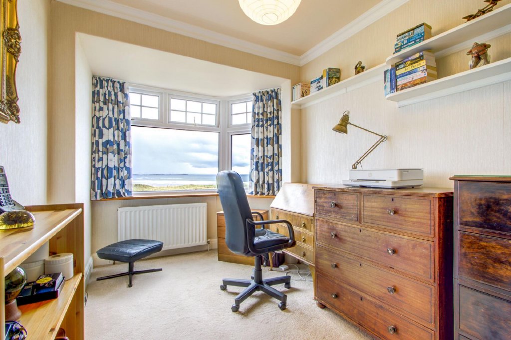Upstairs are four charming bedrooms and a family bathroom with both a bath and a separate shower. The principal bedroom enjoys dual aspect windows with truly exceptional views over the coast and across to Bamburgh Castle. Overlooking the lush green gardens and trees to the rear, it is a room where you can fall asleep to the sound of the waves.