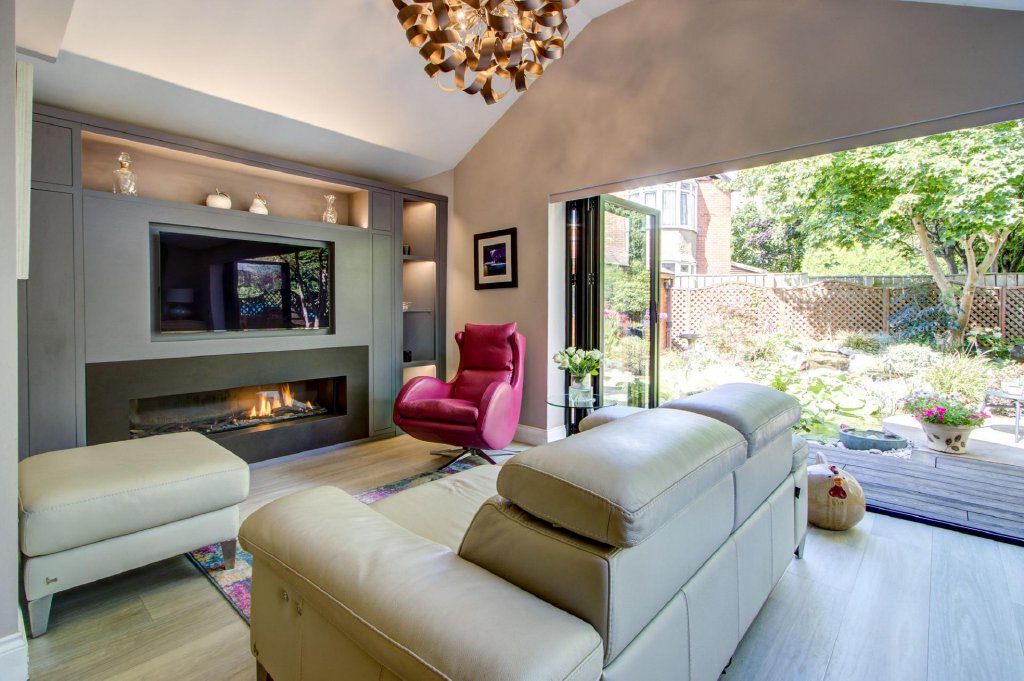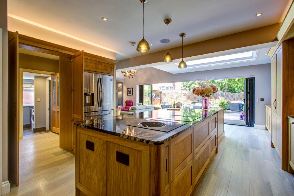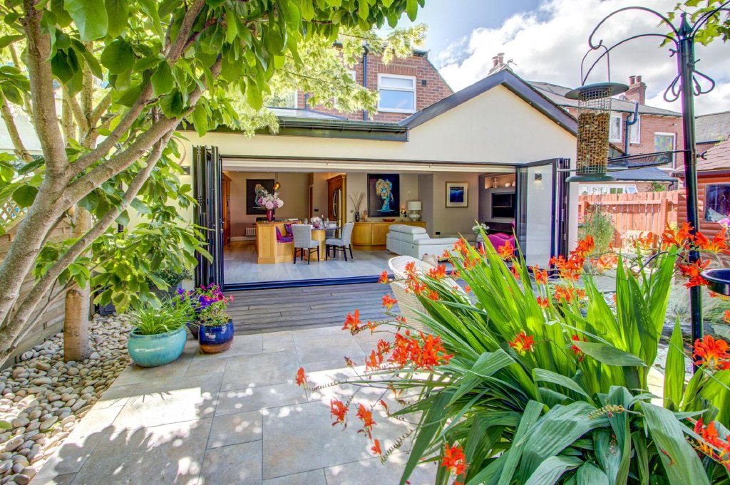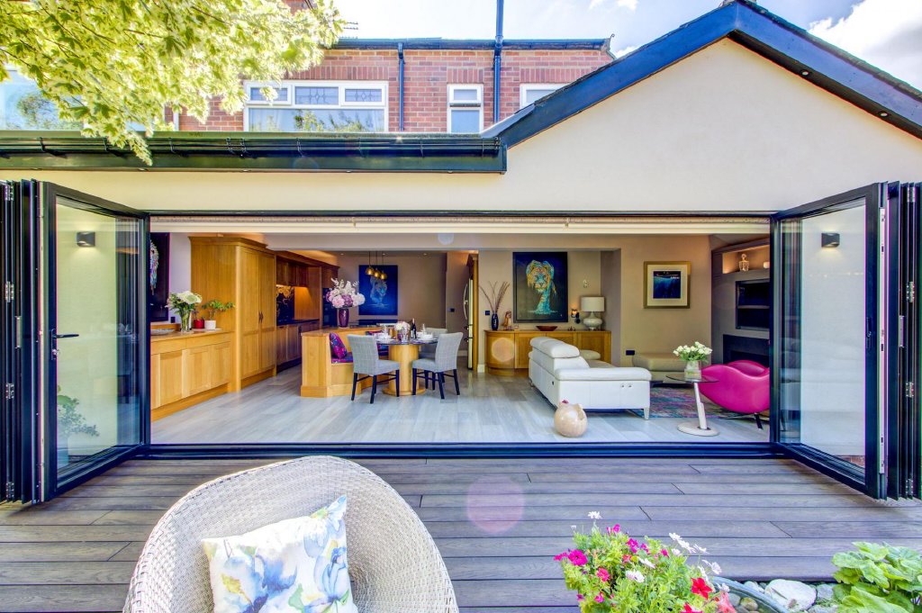 At the heart of the home lies a truly show-stopping open-plan kitchen, dining, and living space—flooded with natural light and designed for modern living. Expansive bi-fold doors open directly onto the landscaped garden, creating a seamless flow between indoor and outdoor spaces.