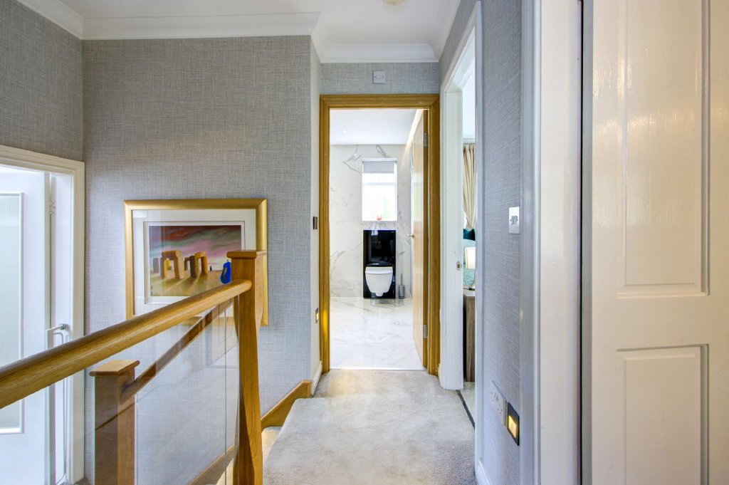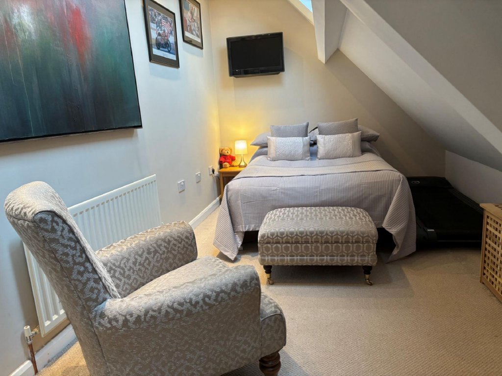 An elegant oak and glass staircase by Neville Johnson leads to a bright and spacious landing, giving access to three generous bedrooms, each complete with fitted wardrobes. The fourth bedroom, currently used as a home office and gym, presents excellent potential—with ample space to add a dormer, creating a fourth double bedroom and the possibility of a second bathroom. A fully boarded loft with lighting and a double socket, accessed via a drop-down ladder from the third bedroom, provides valuable additional storage.