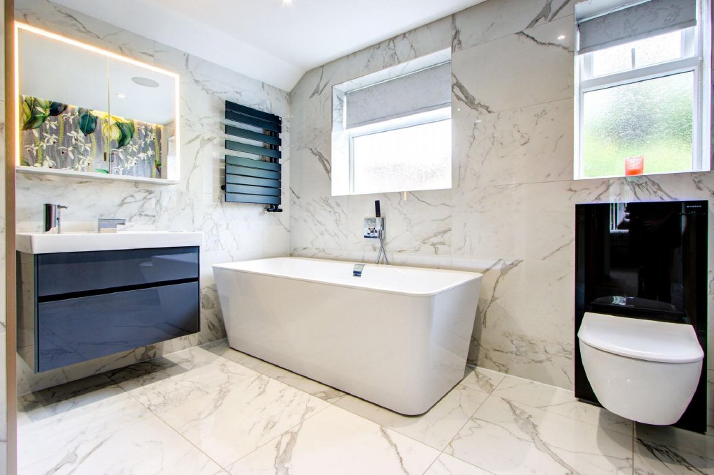 Completing the first floor is a recently renovated family bathroom, beautifully styled and thoughtfully designed with a large bathtub, a walk-in shower with a waterfall showerhead, underfloor heating, Bluetooth ceiling speakers and ambient mood lighting, adding a touch of everyday luxury.