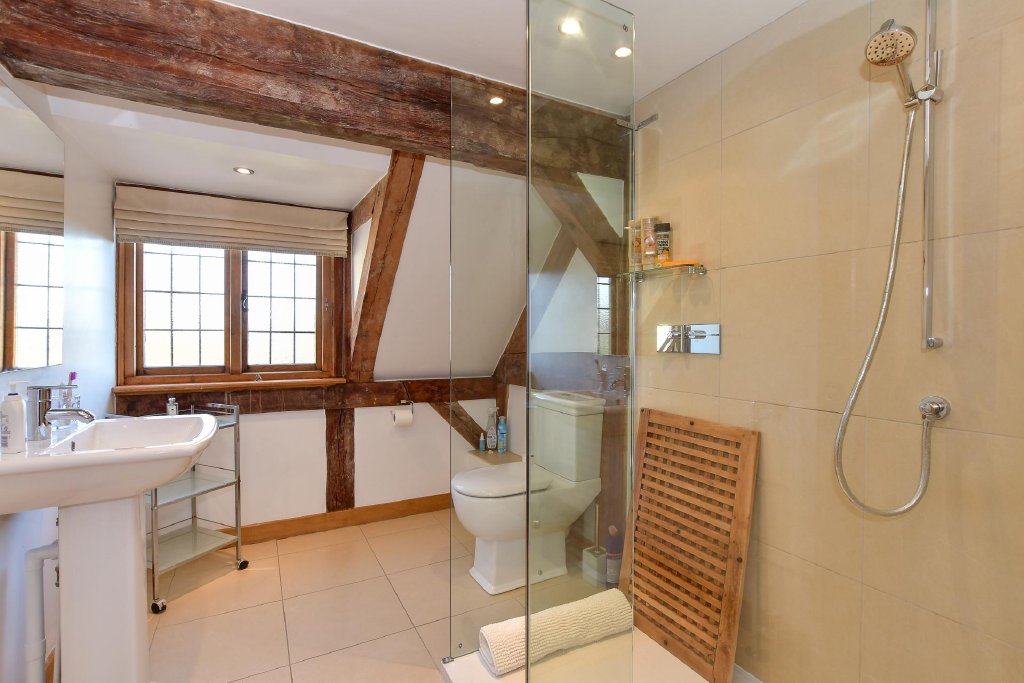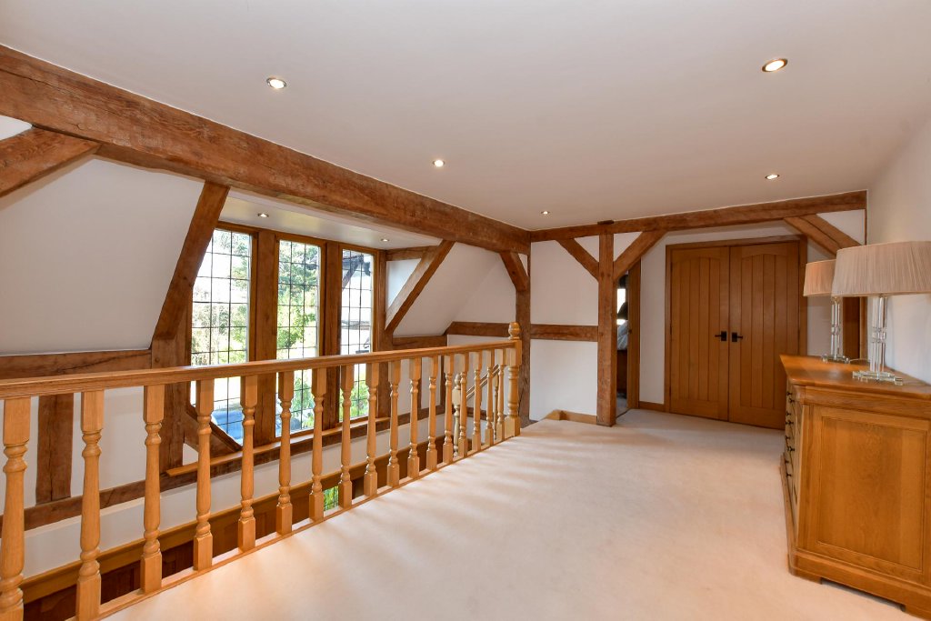 On the semi vaulted first floor the spacious and light galleried landing provides access to the shower room and four dual aspect double bedrooms with exposed beams. The smallest room has fitted cupboards while bedroom one has a high vaulted ceiling and includes a contemporary en-suite bathroom and a large dressing room.