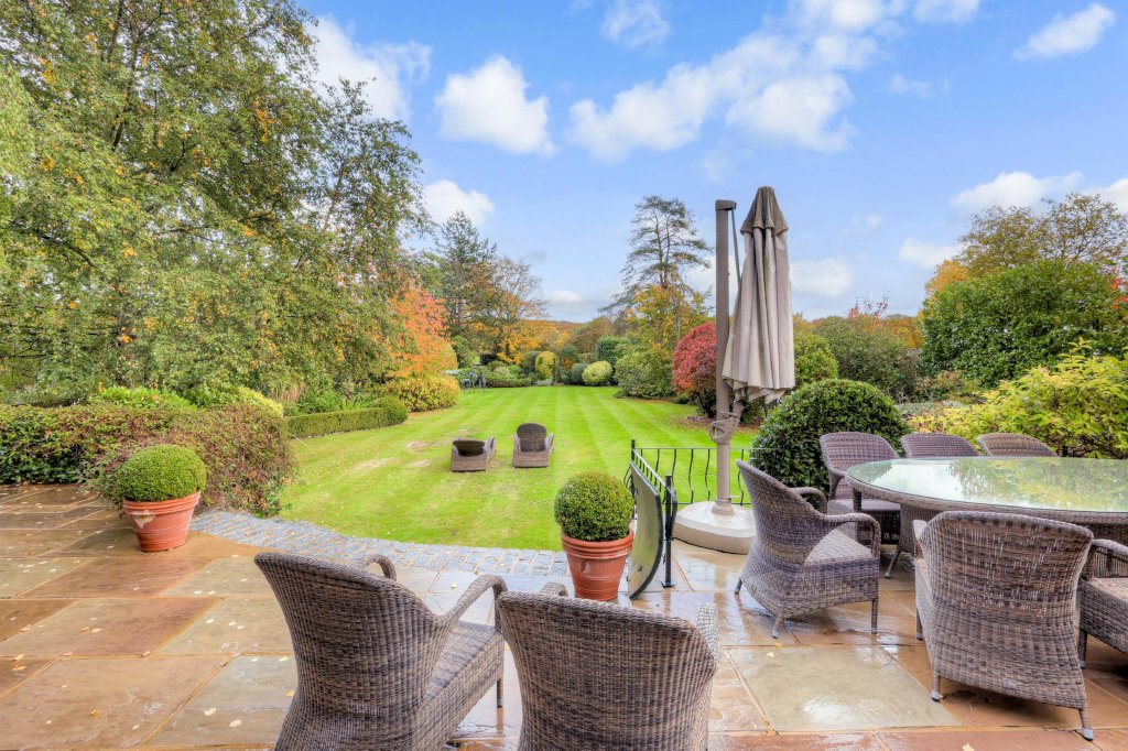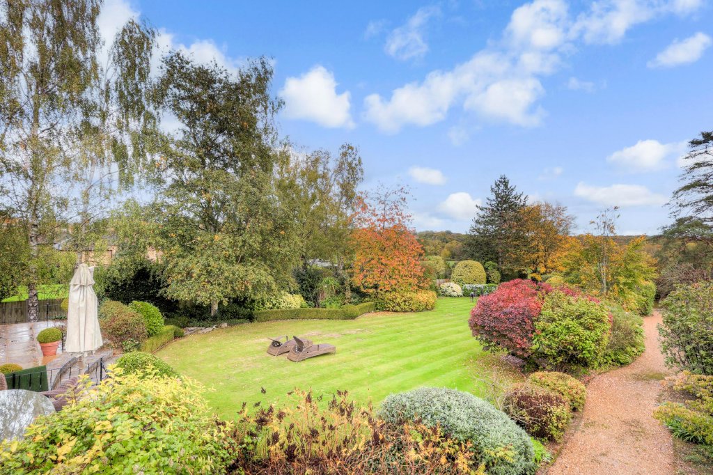 Outside there is a brick built outbuilding and a wide terrace offering stunning views. While the beautifully manicured lawn is surrounded by high hedging, shrub borders and specimen trees.