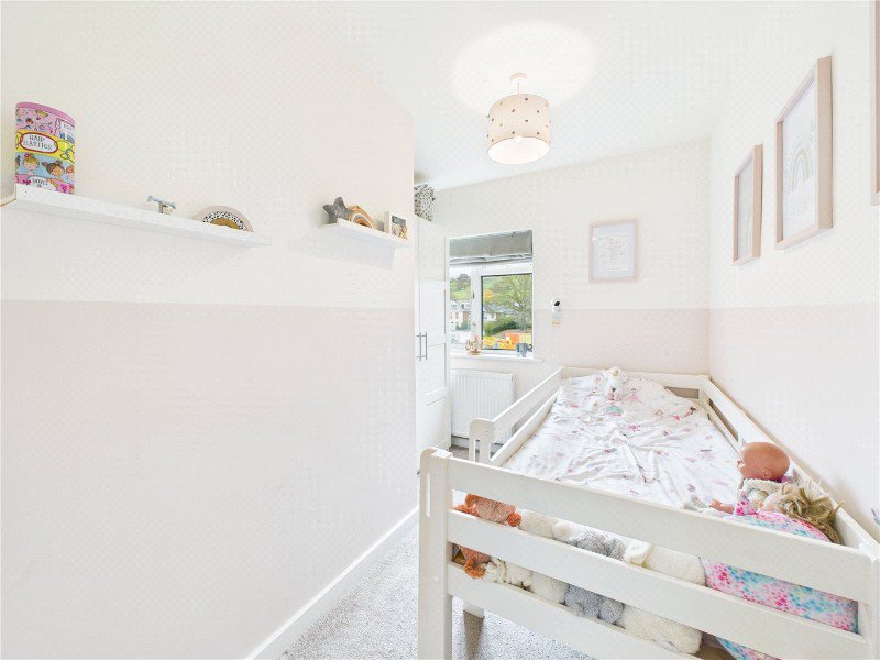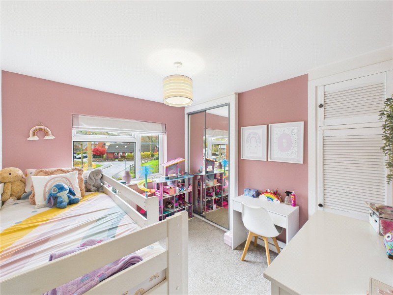 Upstairs, the property offers three well-proportioned bedrooms. The main bedroom includes built-in wardrobes, while bedroom two benefits from fitted wardrobes and a handy over-stairs storage cupboard. The modern family bathroom is finished to a high standard, complete with a shower over the bath.