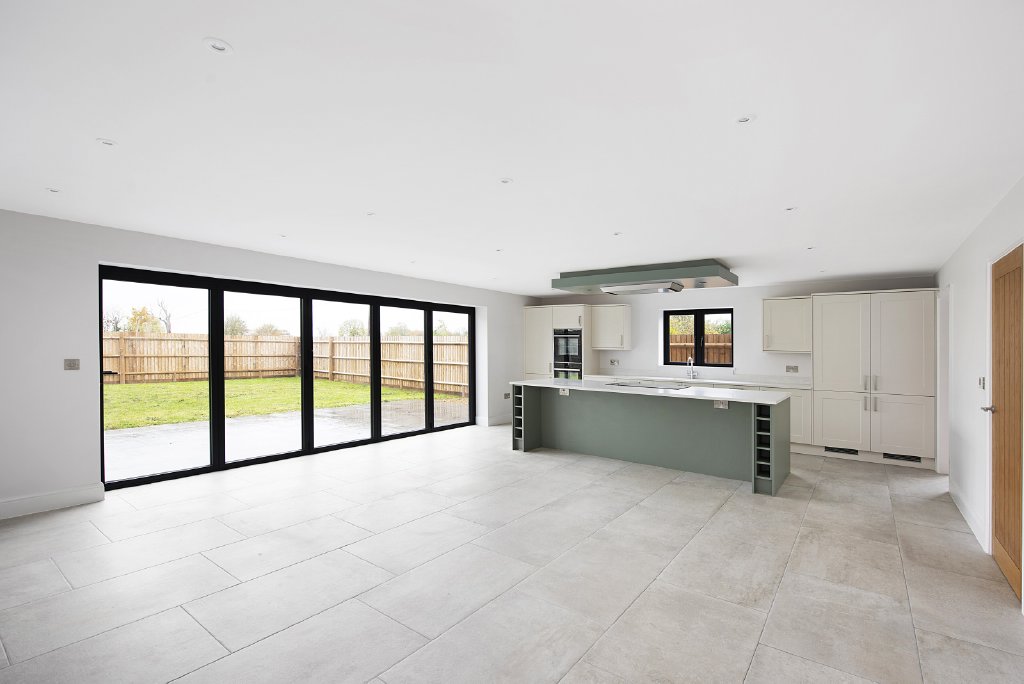 At the heart of the house lies the impressive kitchen/dining/living room, a true centrepiece for modern family living. Expansive bi-fold doors open onto the rear patio, creating a seamless connection between indoors and out, perfect for summer entertaining or relaxed family weekends. The bespoke kitchen features sleek cabinetry, stone worktops, and a large island ideal for breakfast or casual conversation. High-end integrated appliances include two combination ovens, induction hob with built-in extractor, fridge, freezer, dishwasher, and a boiling water tap, ensuring every detail has been considered. The generous proportions of the room provide space for both a dining table and sofa area, making it a space for everyone to enjoy together.