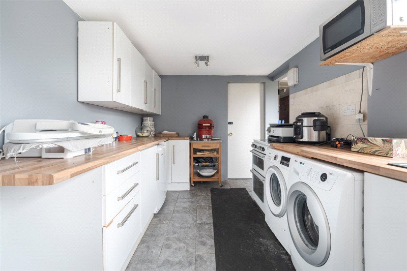 A door leads to a covered passageway giving access to the front and rear gardens, with a coat hanging area. The rear half of the tandem garage is arranged as a utility room, with work surfaces, graphite 1.5 bowl sink, base and wall cupboards, space for white goods, and door to outside.
