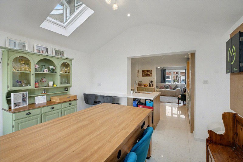 As you enter the property, you are greeted by a newly replastered porch leading into a spacious lounge featuring a large window to the front. This flows seamlessly into the newly refitted kitchen, complete with integrated appliances, a handy utility room, and a separate cloakroom/WC. Continuing into the stunning new family/dining room which showcases the best of contemporary open-plan living, perfect for both relaxed family time and entertaining. The extension boasts a high vaulted cathedral-style ceiling with Velux skylight and lantern with double doors opening onto the rear garden, flooding the space with natural light and offering far-reaching views across open fields.