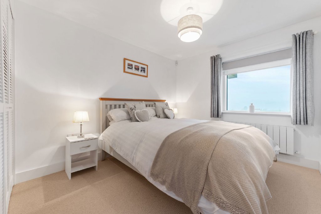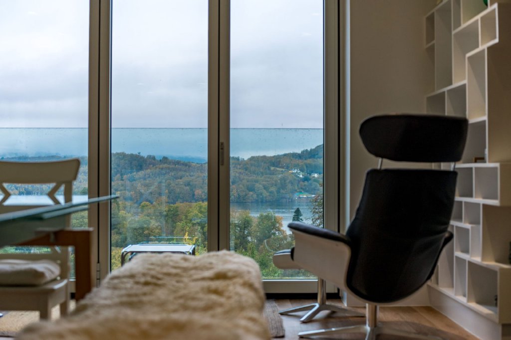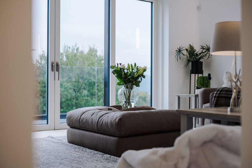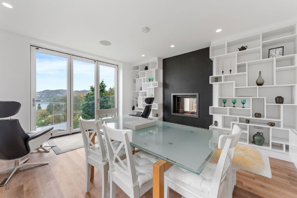 Make your way up to the first floor where you will find the home’s exceptional main living space. The dining kitchen is the perfect space for more formal occasions and entertaining guests, with a comprehensive amount of built in wall and base units, NEFF oven and grill, microwave, built in fridge and freezer, integrated NEFF dishwasher and an additional great space for dining with family or friends, with an outlook to the lake and fells from the bi-folding patio doors and a log burner for those colder nights. This bespoke Stuv multi fuel stove has been customised to be divided between the living room and the dining kitchen to create a cosy atmosphere and was designed to be cost effective for heating both living spaces at the same time, it also comes with a barbeque grill enabling food to be cooked on the fire’s radiant heat. The living room is the properties showstopper, with the spectacular views from the large balcony, this space certainly creates more cosy and intimate occasions, with the added benefit of the double sided wood burning stove. From the living room, there is an additional versatile room with built in cupboards, currently used as an office space, but could also be used as a single bedroom, a games room, a small gym or even a snug. To finish off the first floor is a convenient WC/cloakroom, including washbasin, WC and heated towel rail.
