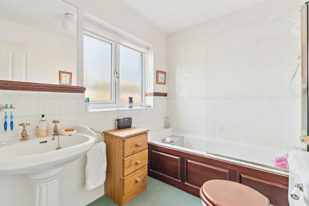 Family bathroom - Suite of panelled bath with overhead shower and glazed screen, low flush WC and wash basin. Ladder radiator. Dado rail. Double glazed window