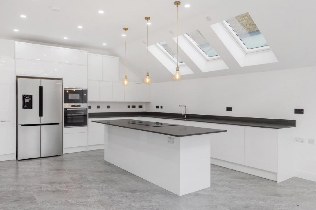 A grand entrance hall sets the tone, leading to two spacious lounge areas designed for both relaxation and entertaining. The layout flows seamlessly to a large kitchen that spans the full width of the property, fitted with bespoke cabinetry, premium appliances and ample space for dining. A separate utility room and a stylish ground-floor bathroom add to the home’s thoughtful functionality.