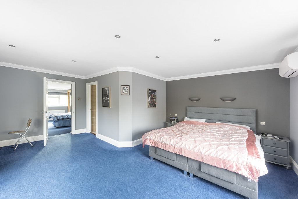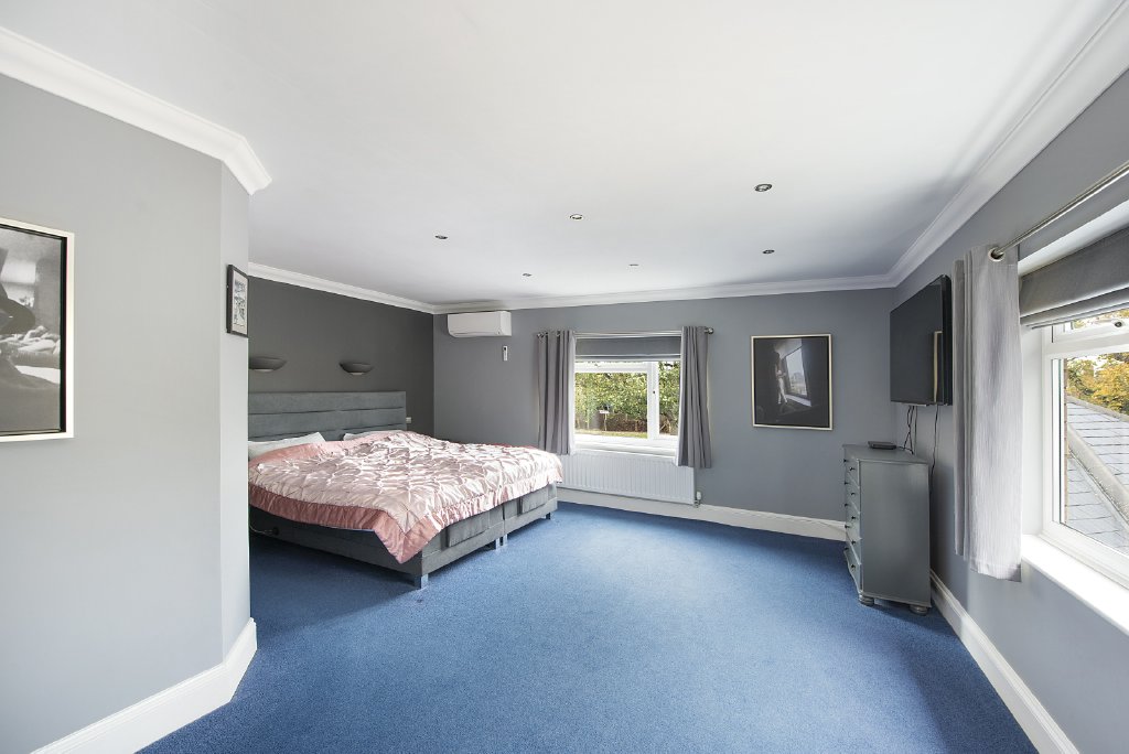 Upstairs, a generous landing leads to five bedrooms, including a luxurious principal suite with en-suite shower room and adjoining dressing room or fifth bedroom. A contemporary family shower room completes the accommodation, with split heat pump air-conditioning units ensuring year-round comfort.