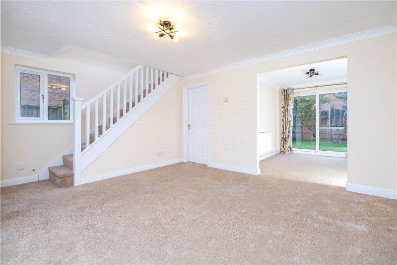 The entrance hall leads through to a bright and welcoming lounge, with a large window to the front creating plenty of natural light. The living space opens into a dining area at the rear, where sliding patio doors lead directly out to the garden.