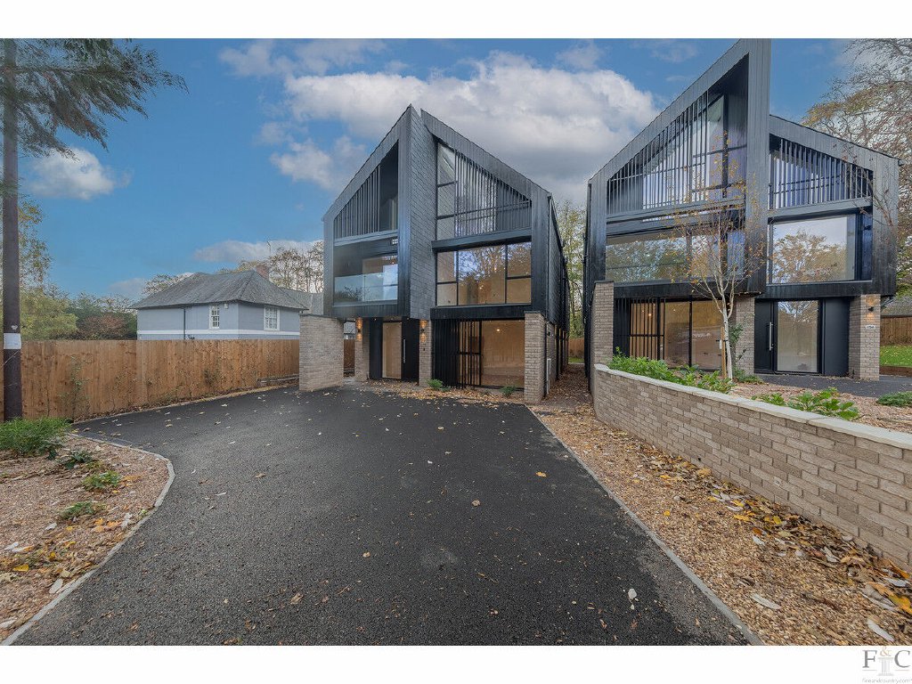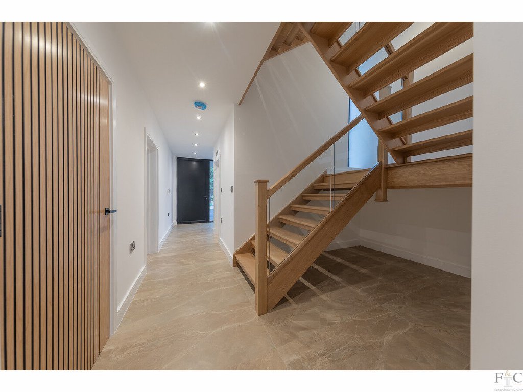 A sculptural oak staircase ascends to the first floor, where four generous double bedrooms await. The principal suite is a haven of calm, featuring a walk-in dressing area, luxurious en suite, and a private glass balcony overlooking the treetops of the neighbouring Attenborough Arboretum. Another bedroom benefits from its own en suite, while two further bedrooms share a beautifully appointed family bathroom.