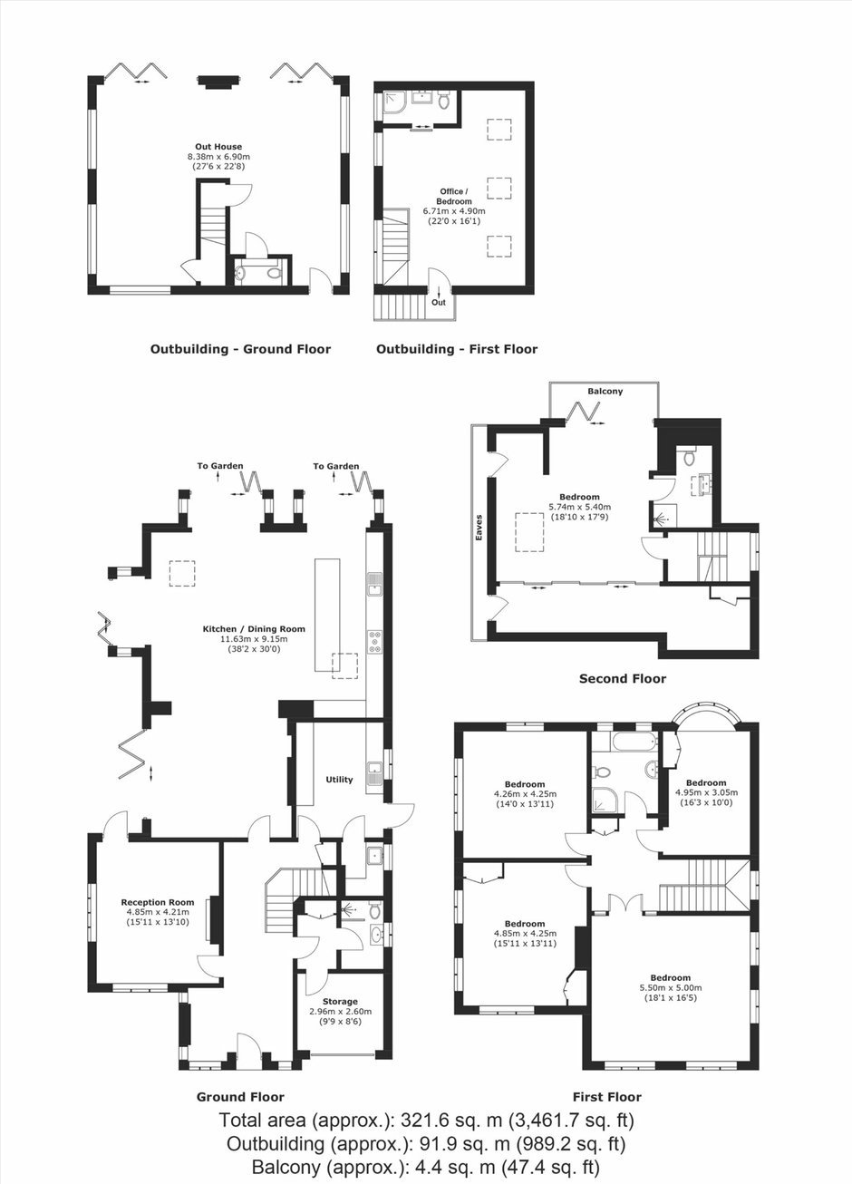 The first floor provides four double bedrooms served by a stylish bathroom with the second floor dedicated to a principal bedroom suite with bathroom and a South-West facing balcony.