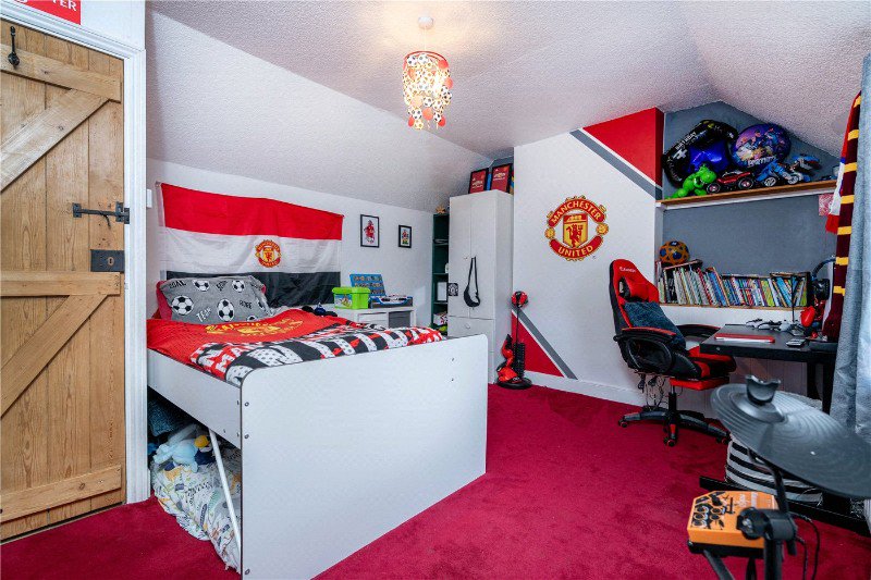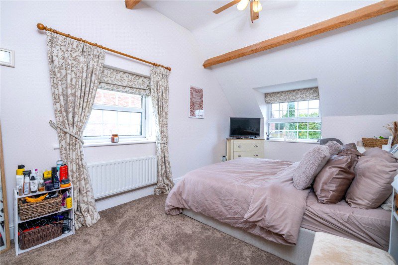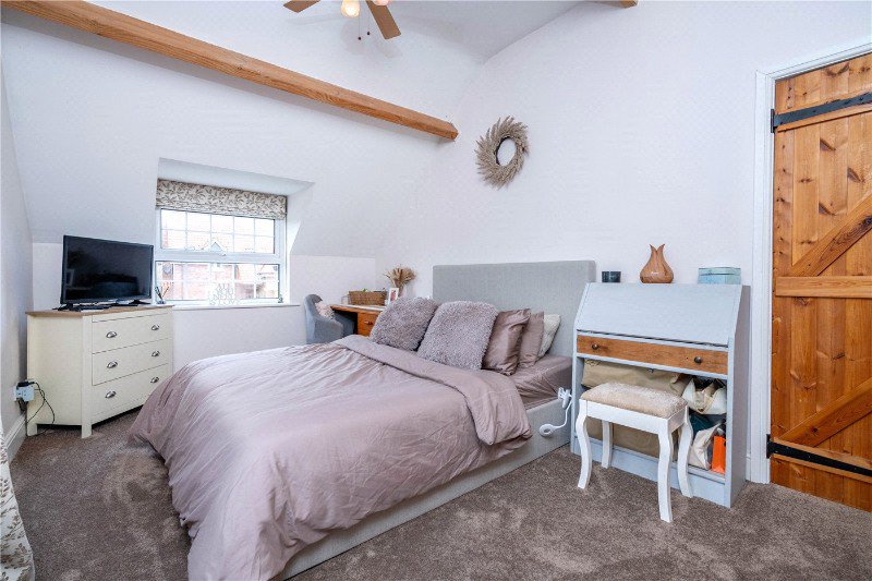 Upstairs, there are four comfortable double bedrooms, each full of character. The main bedroom has a vaulted ceiling with exposed beams, a built-in wardrobe and an en suite shower room. The family bathroom includes a corner bath and colourful tiling that adds a touch of charm and personality.