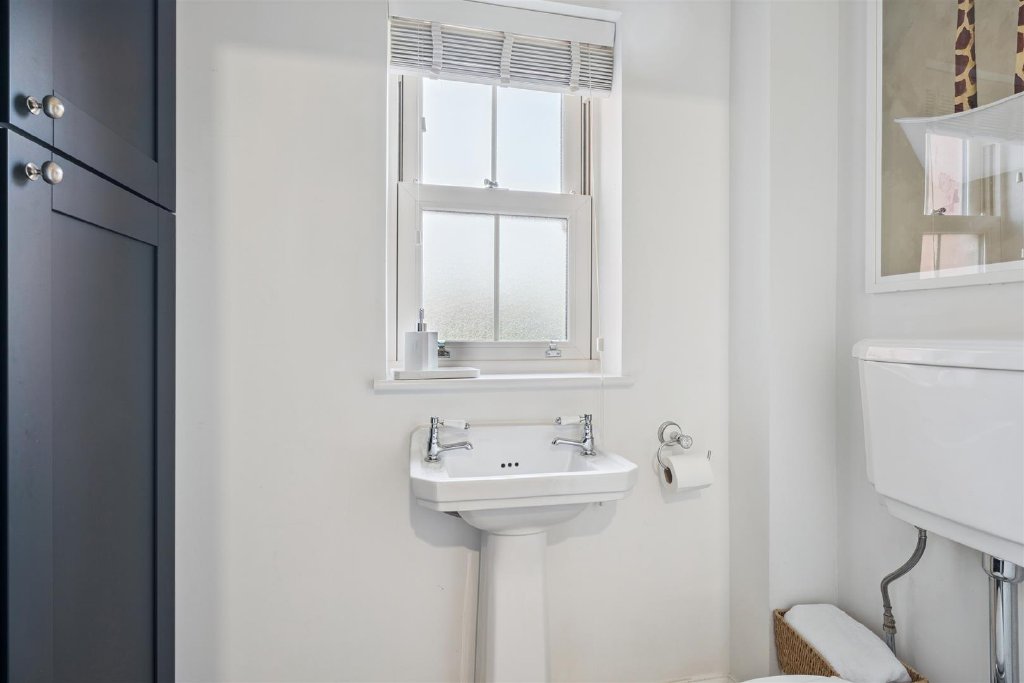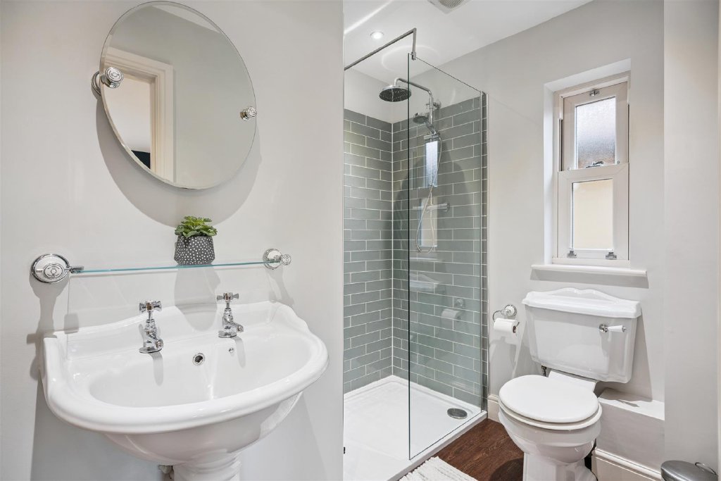 The stylish family bathroom has a four piece suite comprising low level w.c., wash hand basin, a roll-top bath with claw feet, and a double width shower cubicle. Heated towel rail/radiator. Obscure double glazed window to the front aspect.