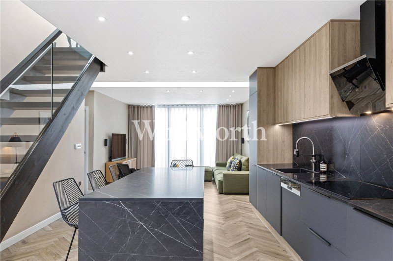 The ground floor forms the heart of the home, beginning with a beautifully composed living room and kitchen that stretches across the entire home. The space has a real architectural presence, shaped by long clean sightlines, generous glazing and a layout that feels both open and extremely well defined. The kitchen sits to one side with a continuous run of cabinetry, a wide workspace and an elegant arrangement of appliances that creates a calm visual rhythm. The living area flows effortlessly beside it, offering significant wall space for art and furniture placement and giving the whole room a gallery like quality.