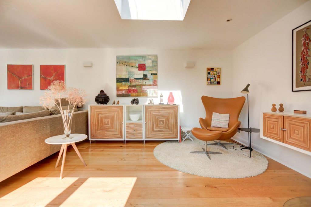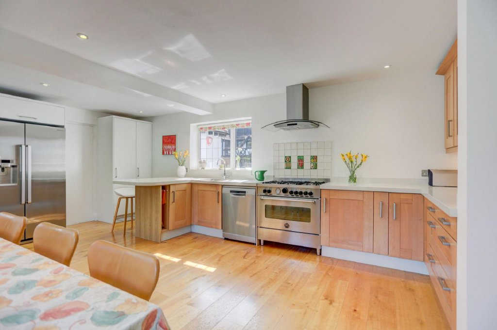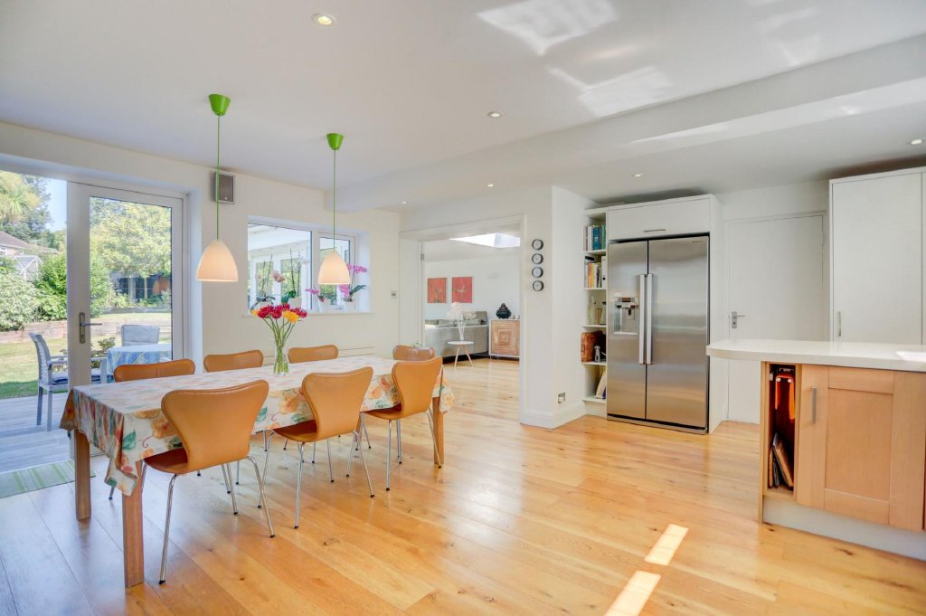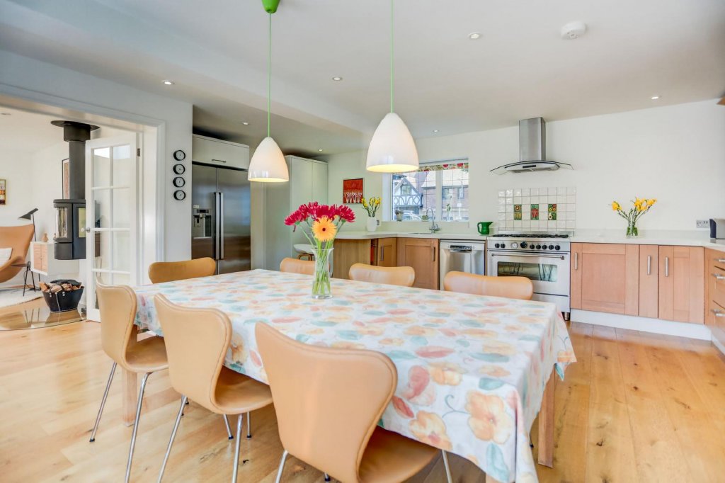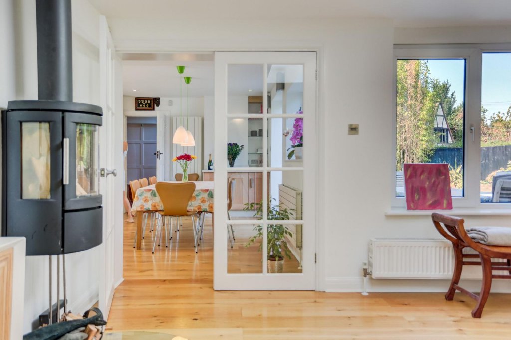 The kitchen is light-filled and contemporary, styled with a clean Scandinavian influence. White stone wrap-around surfaces are complemented by wooden cabinetry, while natural floorboards unify the ground floor. A dining area sits at the heart of the space, perfect for informal family meals. From here, French doors lead to a bright rear sitting room, ideal for entertaining with garden views in summer or transforming into a cosy snug with a log-burning fire in the cooler months.