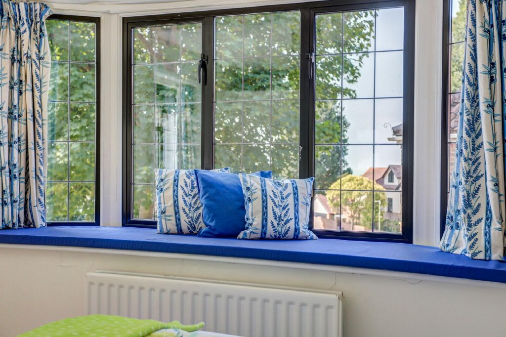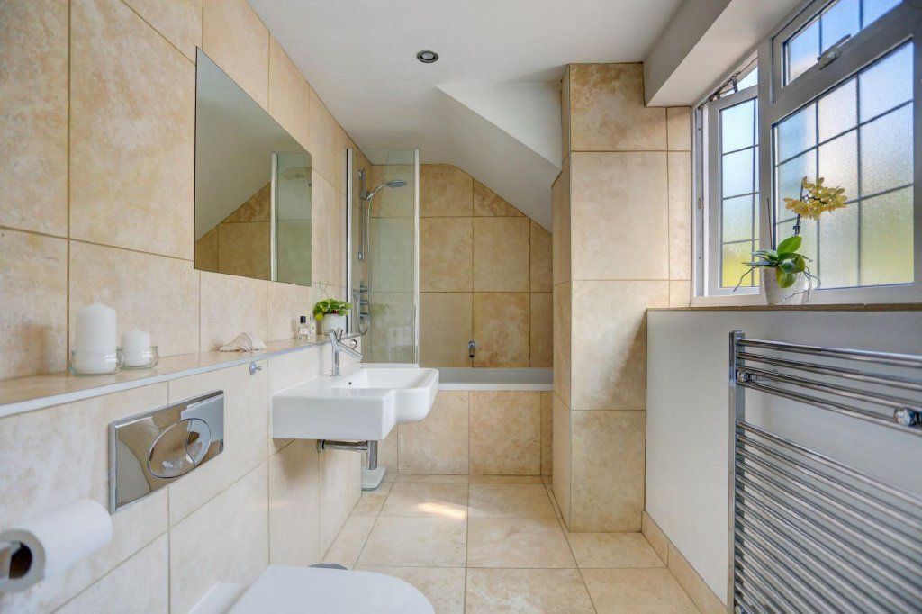 A striking staircase, illuminated by a double-height wrought iron Art Deco window, leads to the first floor. Here, four generously sized double bedrooms await, three with built-in wardrobes. The primary suite enjoys ample storage and a private ensuite with walk-in shower, while the family bathroom is finished in calming, earthy tones and fitted with both bath and overhead shower. There is also a useful spacious loft storage for luggage and seasonal decorations accessed from this level.
