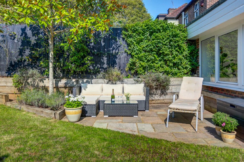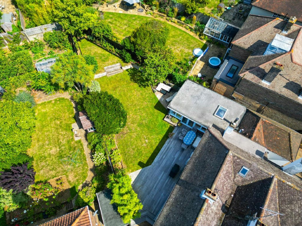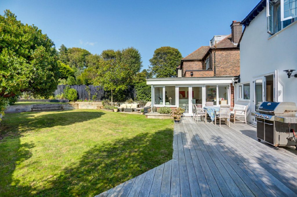 Accessible from multiple rooms, the wrap-around garden grounds the property in lush surroundings. Mature borders and expansive lawns create a private retreat for relaxation and play. At the rear, a decked terrace provides the perfect setting for outdoor dining and summer entertaining.
