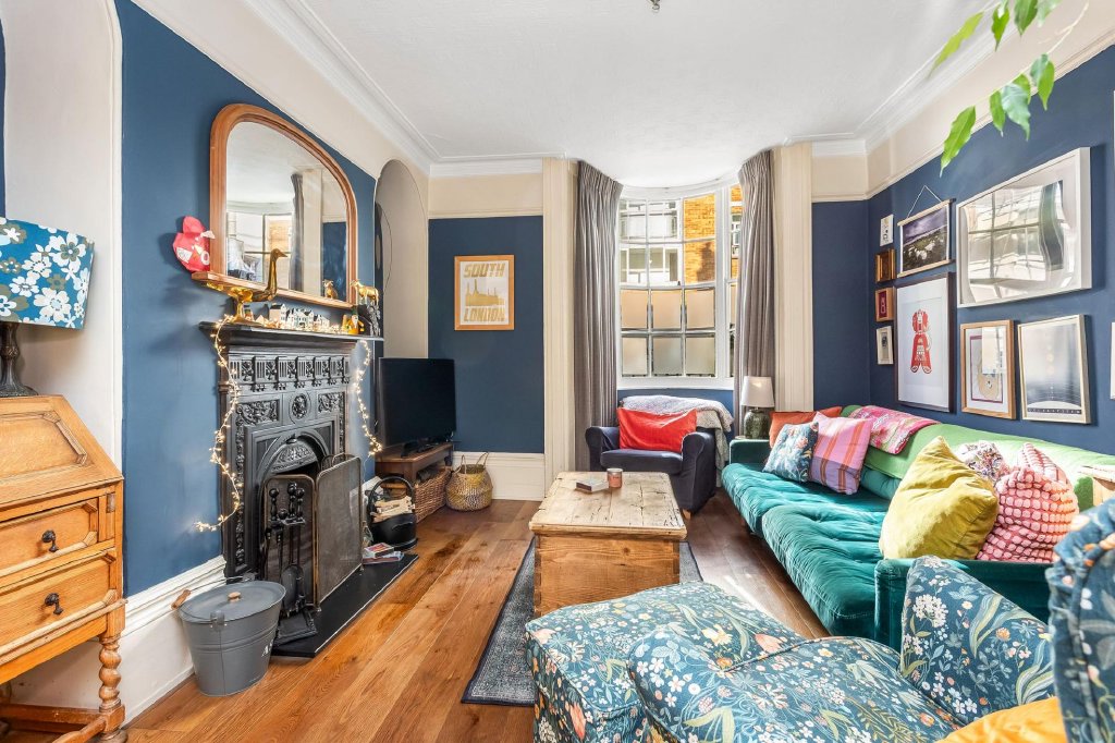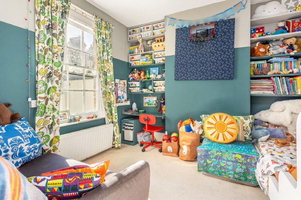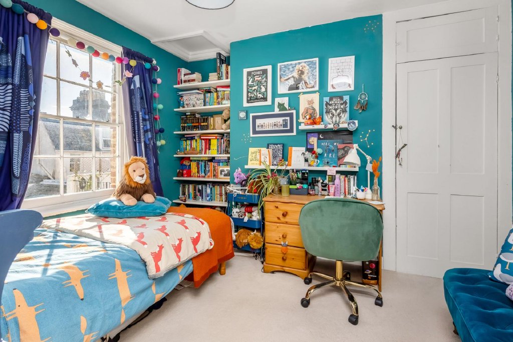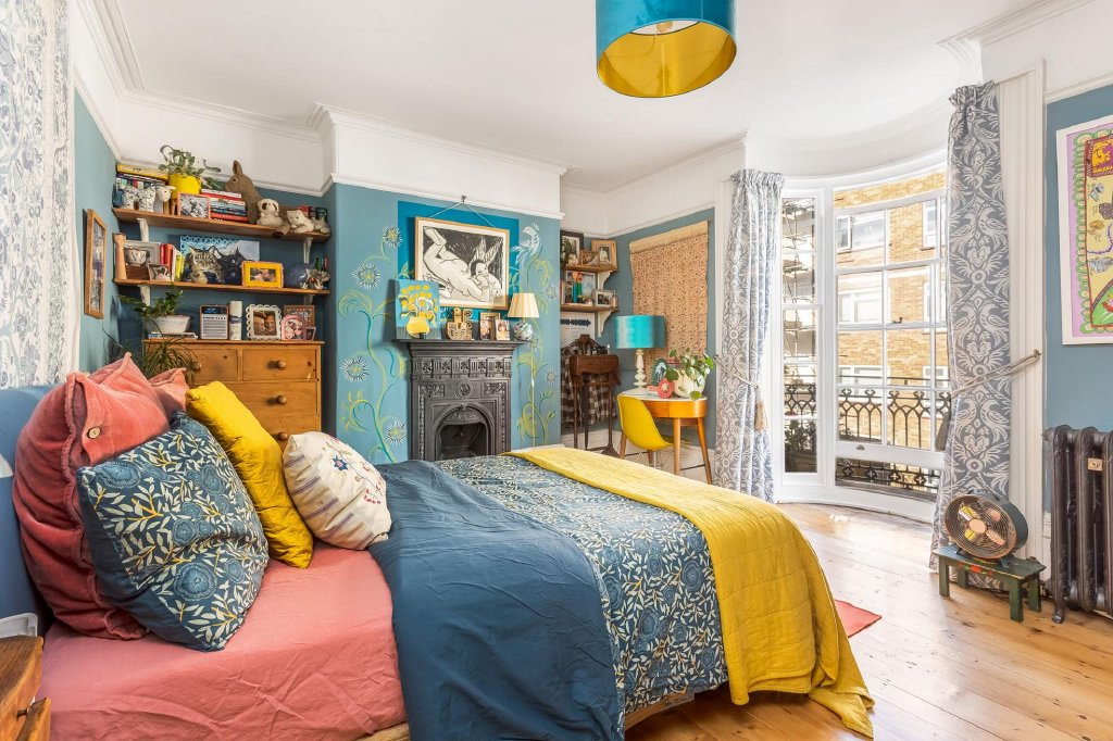 Farrow and Ball Inchyra Blue painted walls and soft oatmeal carpet are in the adjacent bedroom, chimney breast alcoves add to the floor space and a sash window offers views of the Brighton rooftops.