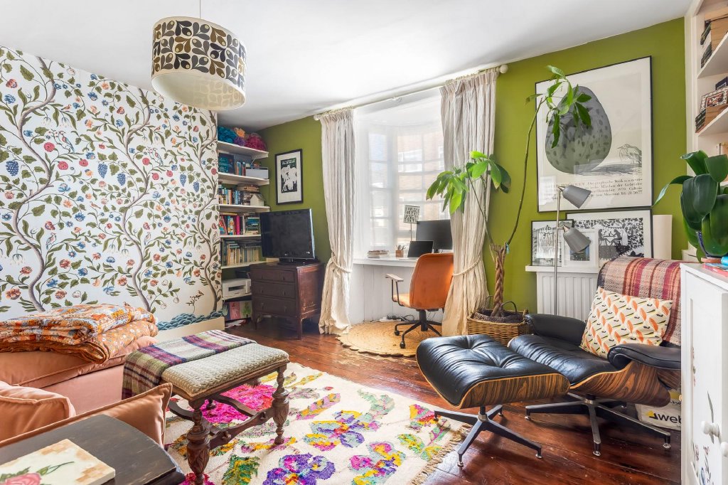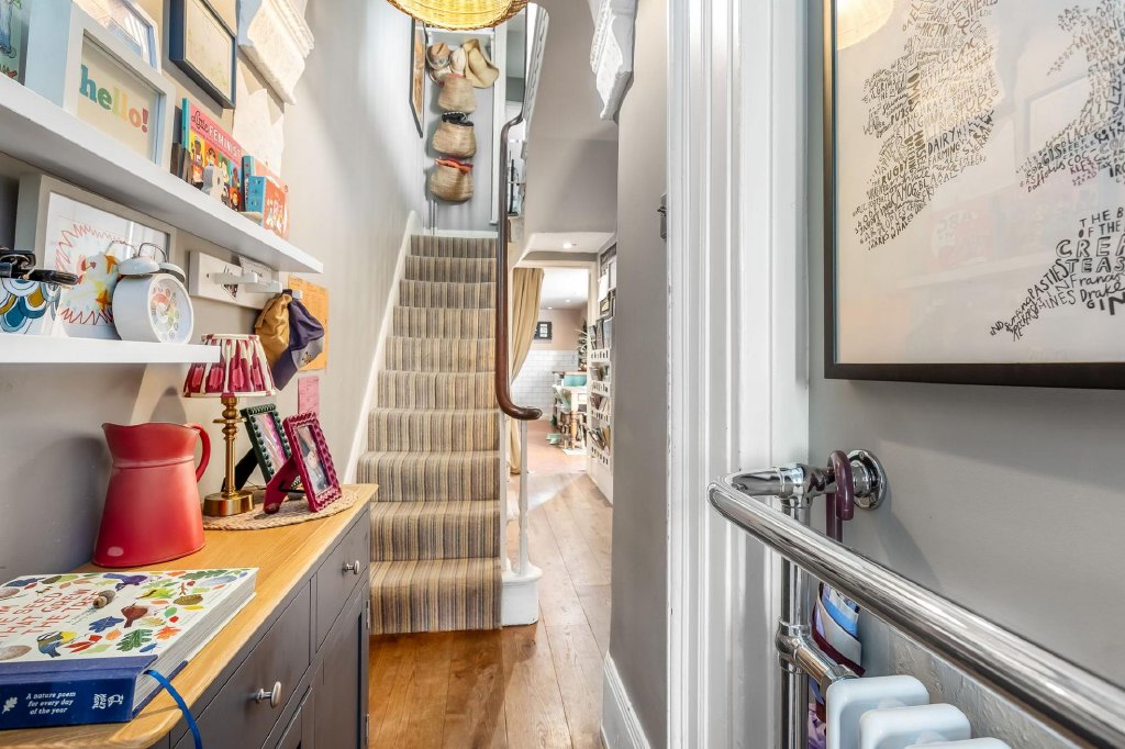 A leaded, stained glass door opens onto the hallway and beautifully lights the warm tones of the engineered wood floor that stretches out across the ground floor of this welcoming townhouse.