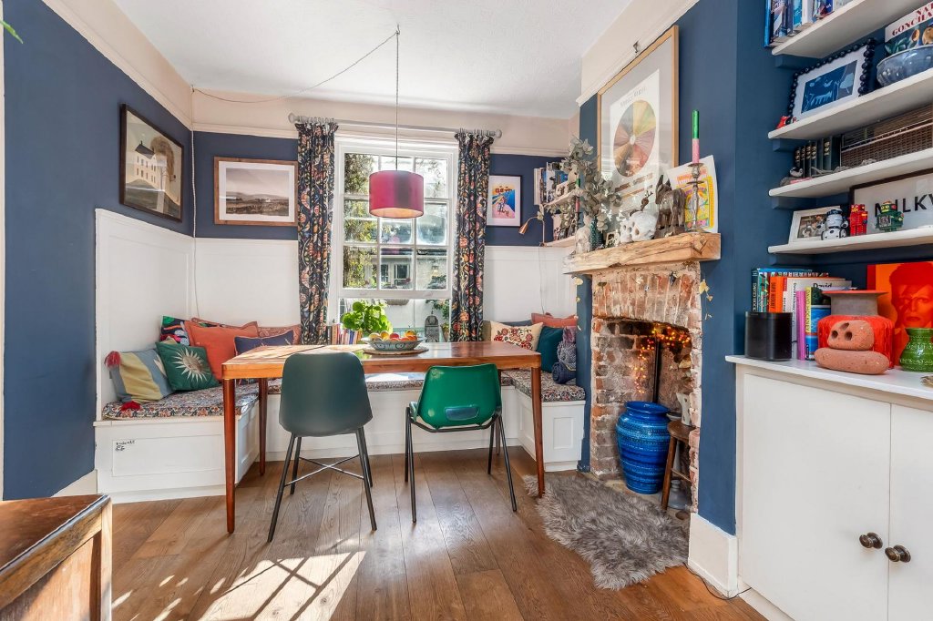 A multi-paned sash window overlooks the pretty enclosed courtyard from the dining room and elegant Farrow and Ball Stiffkey blue walls adds to the charm and character of the space.