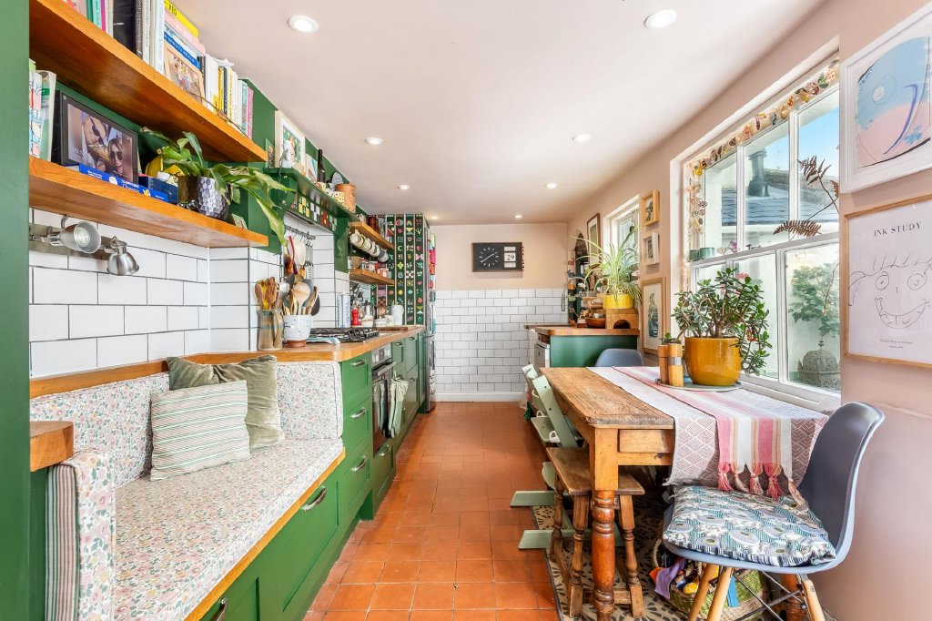 Wood worktops sit beneath sleek white metro tiles in the family-sized kitchen. Fully fitted with a wealth of heritage green cabinets, deep butler sink and integrated appliances, there is plenty of space for a breakfast table and a cosy built in bench. The pantry at the far end provides invaluable storage and a demi-glazed door opens directly onto the enclosed, pretty courtyard.
