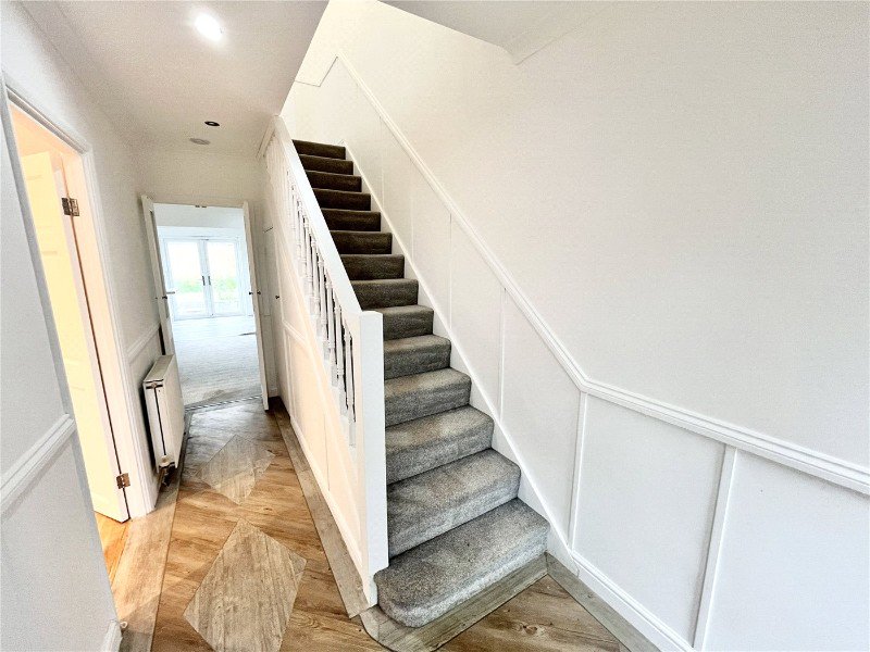 Hallway: -Stairs leading to first floor, under stairs storage cupboard, wood effect flooring, single radiator, doors to: -