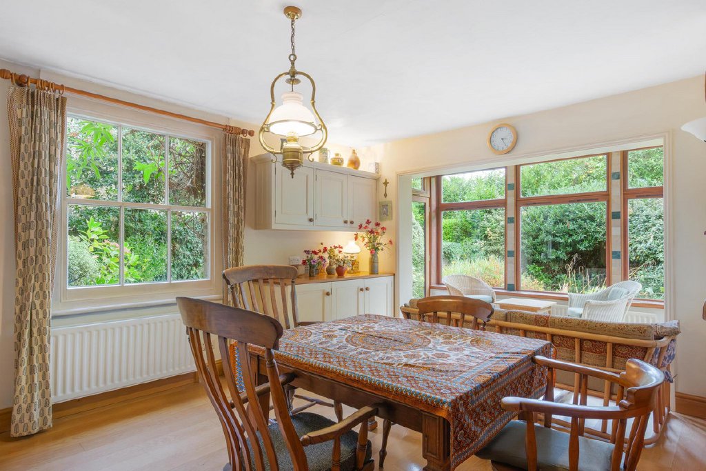 The ground floor offers an abundance of living space, featuring two bright reception rooms, a well-proportioned kitchen, and a large dining area with beautiful views over the expansive south-facing garden, perfect for family gatherings or entertaining guests.