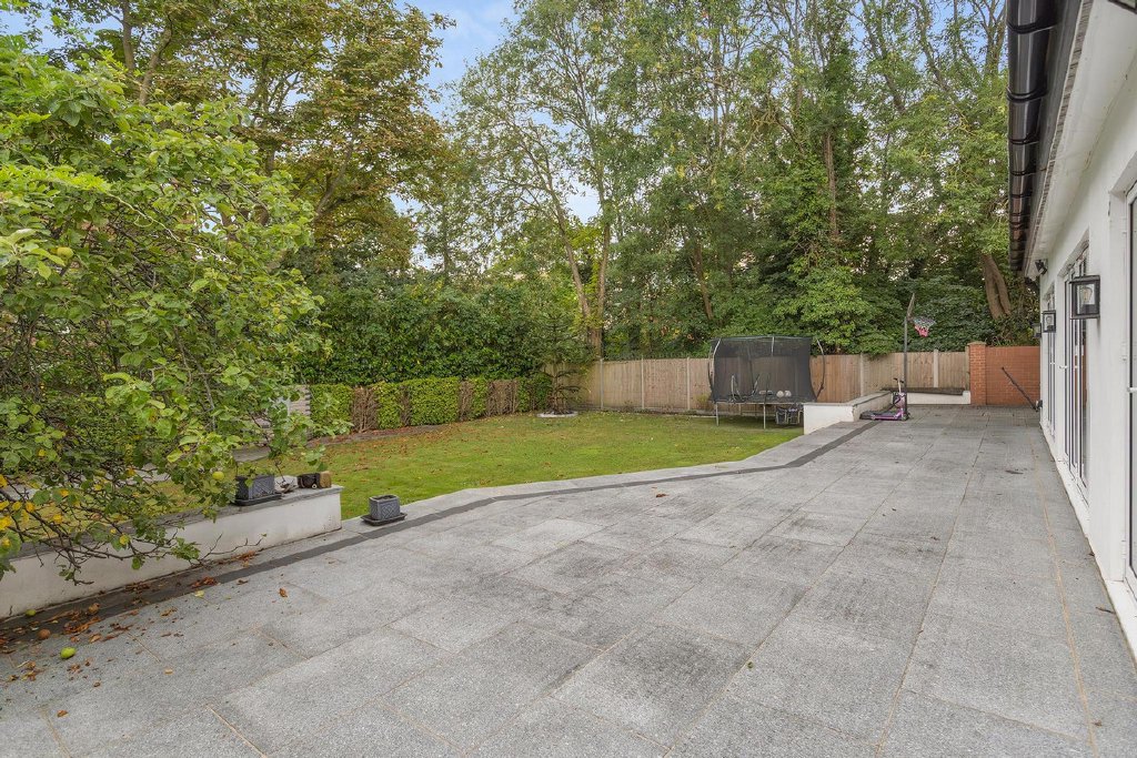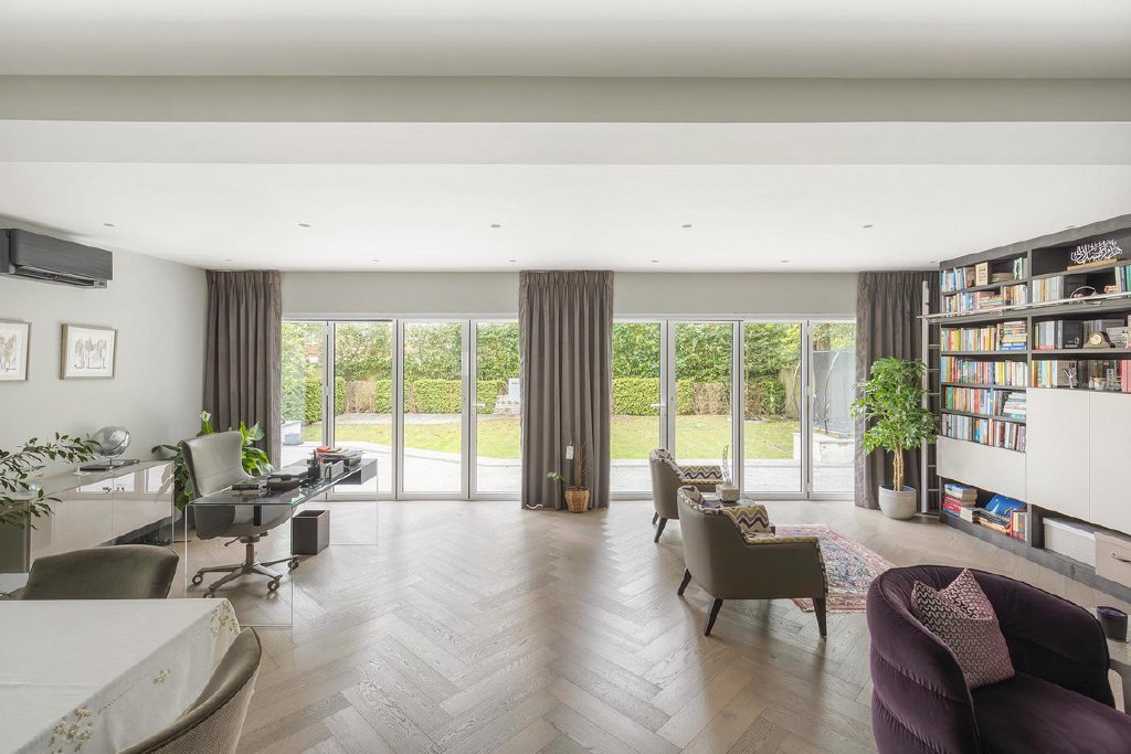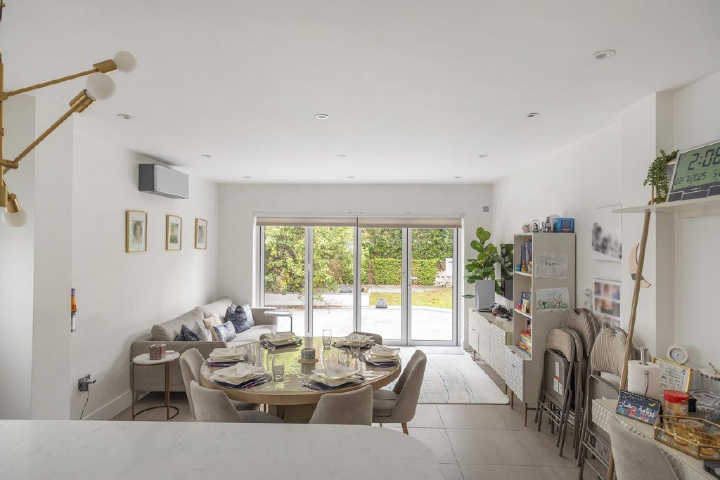 At the heart of the home lies a stunning open-plan kitchen and dining room extending over 30ft in length, complete with high-spec integrated appliances and extensive bespoke cabinetry. French doors open directly onto a sun-drenched, south-facing garden—measuring approximately 65ft x 57ft—perfectly designed for both entertaining and relaxed family living. A grand formal reception room of 24ft mirrors this flow to the garden, while a further informal sitting room and versatile study or playroom provide ample space for multigenerational living or working from home.