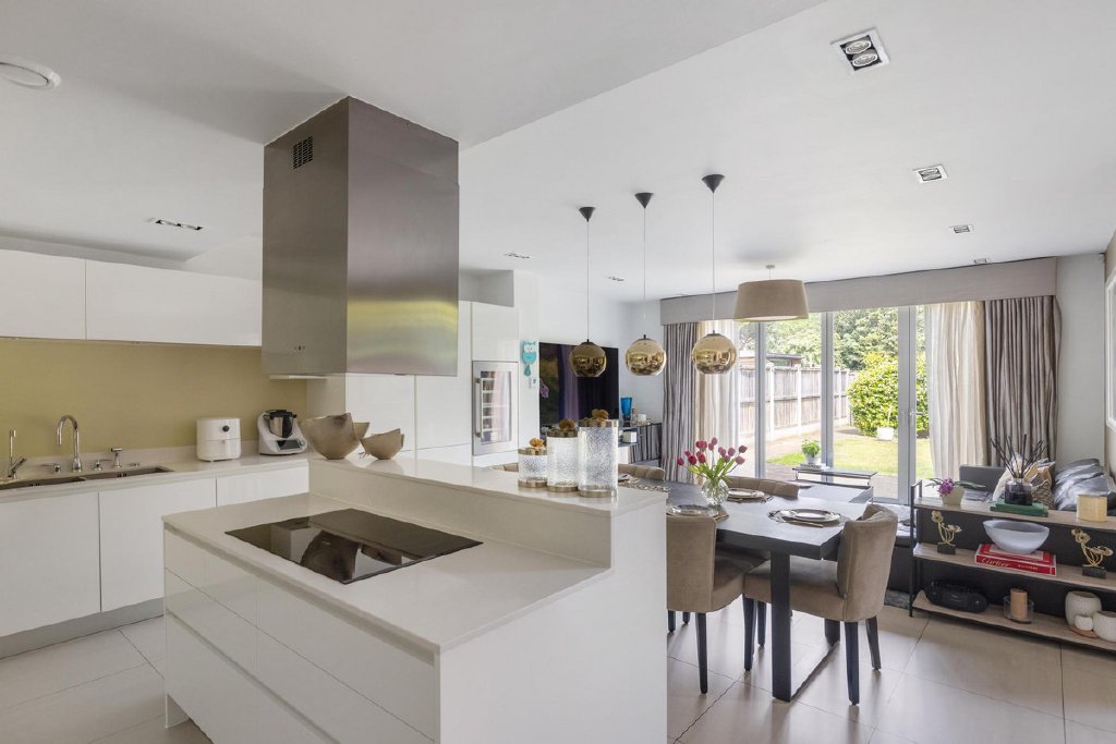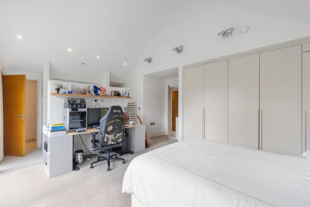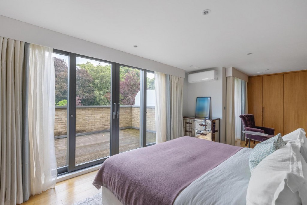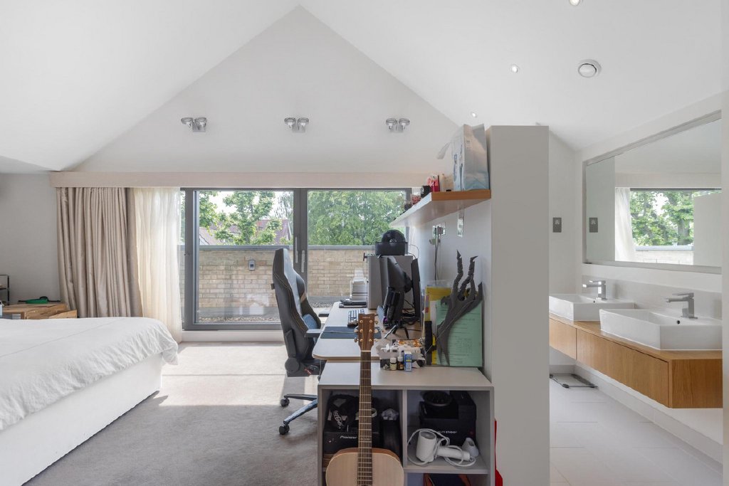 Inside, bespoke craftsmanship and thoughtful design are evident throughout. The ground floor is anchored by a stunning open-plan kitchen and living area, designed by ROK and finished with sleek stone worktops and energy-efficient Miele appliances. This exceptional space is flooded with natural light and opens directly onto a beautifully landscaped, east-facing private garden, ideal for entertaining or quiet relaxation.