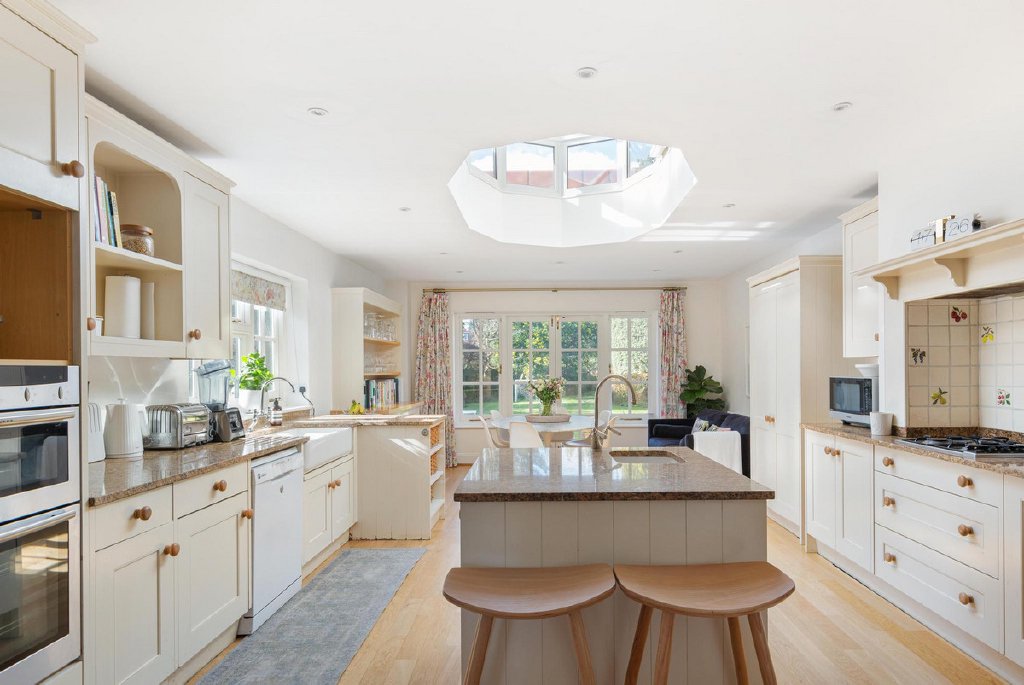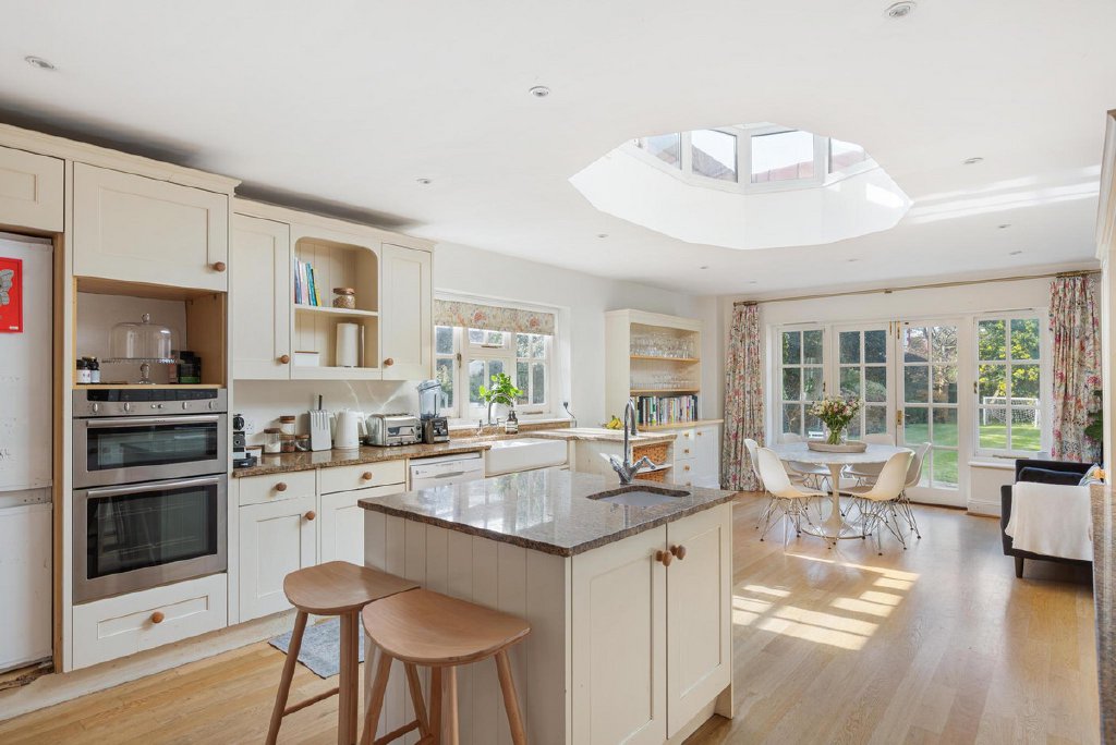 Currently spanning 3,178 sq ft, the residence comprises a generous principal bedroom suite with a spacious ensuite bathroom, four additional bedrooms, two further bathrooms, two elegant reception rooms, a superb 29-foot kitchen/breakfast room, a dedicated study, a playroom, a garage/gym, a utility room, a cellar, and ample off-street parking for multiple vehicles.