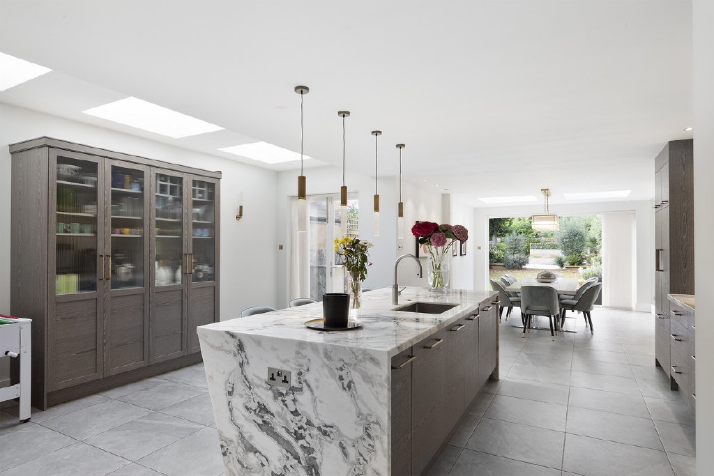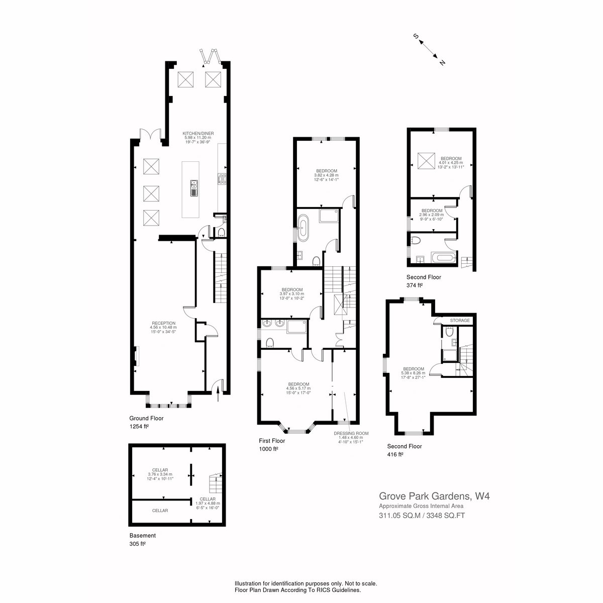 The ground floor features an impressive 35ft open-plan living space, perfect for both entertaining and family life. The expansive reception area flows seamlessly into the heart of the home—a spectacular kitchen complete with a sleek, central island, spacious dining area and ample storage throughout the kitchen, there is also a W.C for added convenience. Floor-to-ceiling bi-fold doors open onto the breathtaking south-facing garden, creating a light-filled, indoor-outdoor living experience. Additionally, the property includes a basement, offering excellent storage space. There is also the potential, subject to planning permission (STPP), to excavate further, as some of the neighbouring homes have done. This could significantly expand the already impressive 3,348 sq ft footprint, providing even more versatile living space.