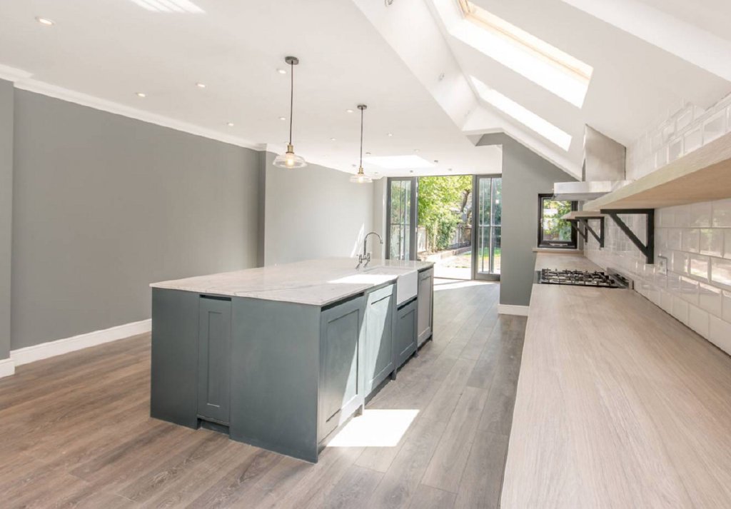 Entering through the receiving hallway, the property leads through to a double aspect reception room, a second open plan reception room with an impressive kitchen featuring integrated appliances, an island counter-space, space for dining and bi folding doors leading out to the private rear garden.
