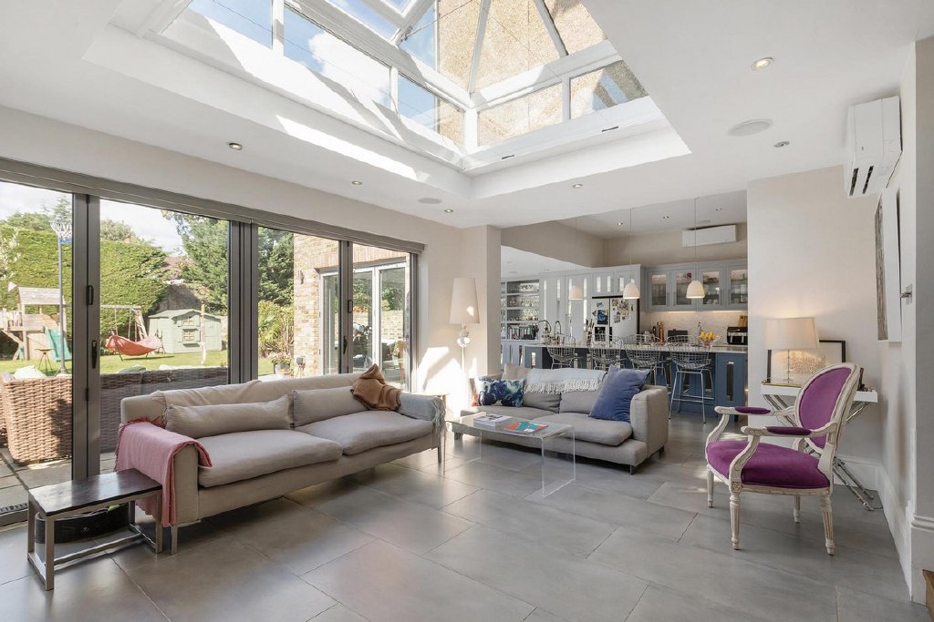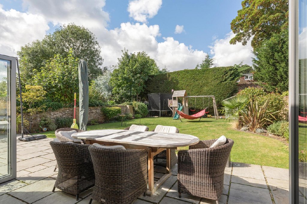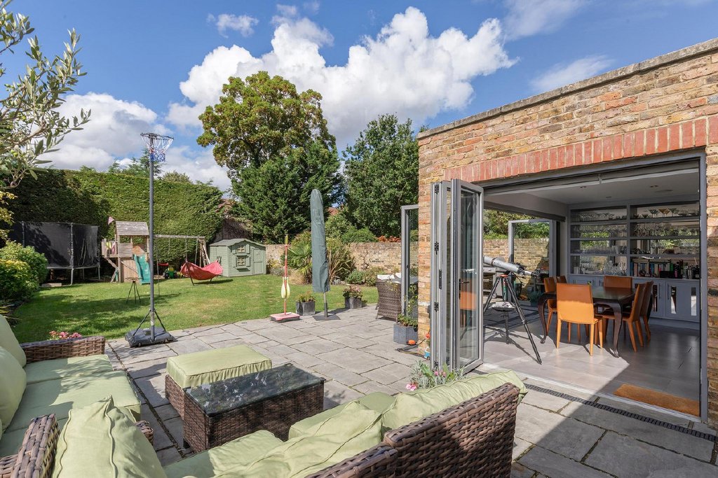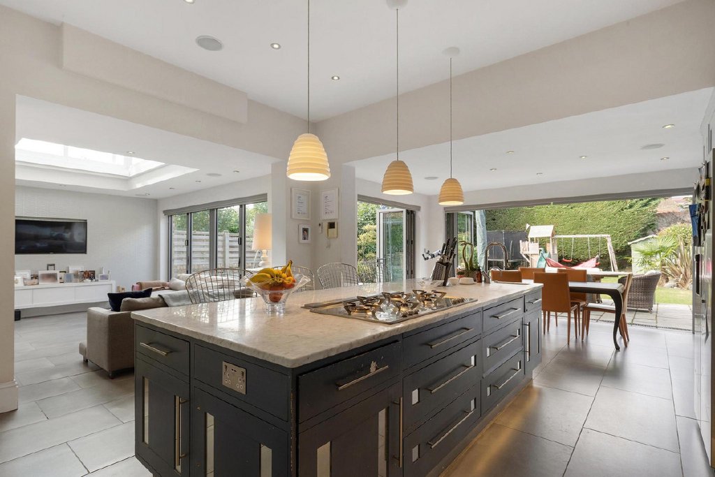 At the rear of the property, an impressive open-plan kitchen and dining area awaits. This thoughtfully designed space, overlooking the garden, features a contemporary designer kitchen with abundant storage, premium integrated appliances, and a stunning central island with a breakfast bar. Natural light floods in through the overhead skylight, creating a bright and airy atmosphere in the dining area, which opens onto a large patio and the beautifully landscaped 60-foot westerly-facing garden—perfect for al fresco dining, family BBQs, or children’s playtime. A downstairs cloakroom, utility room, and additional storage complete the ground floor.