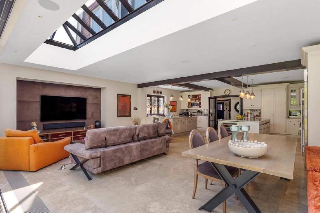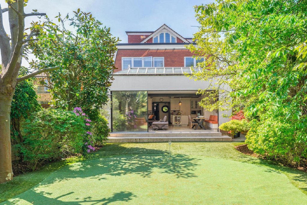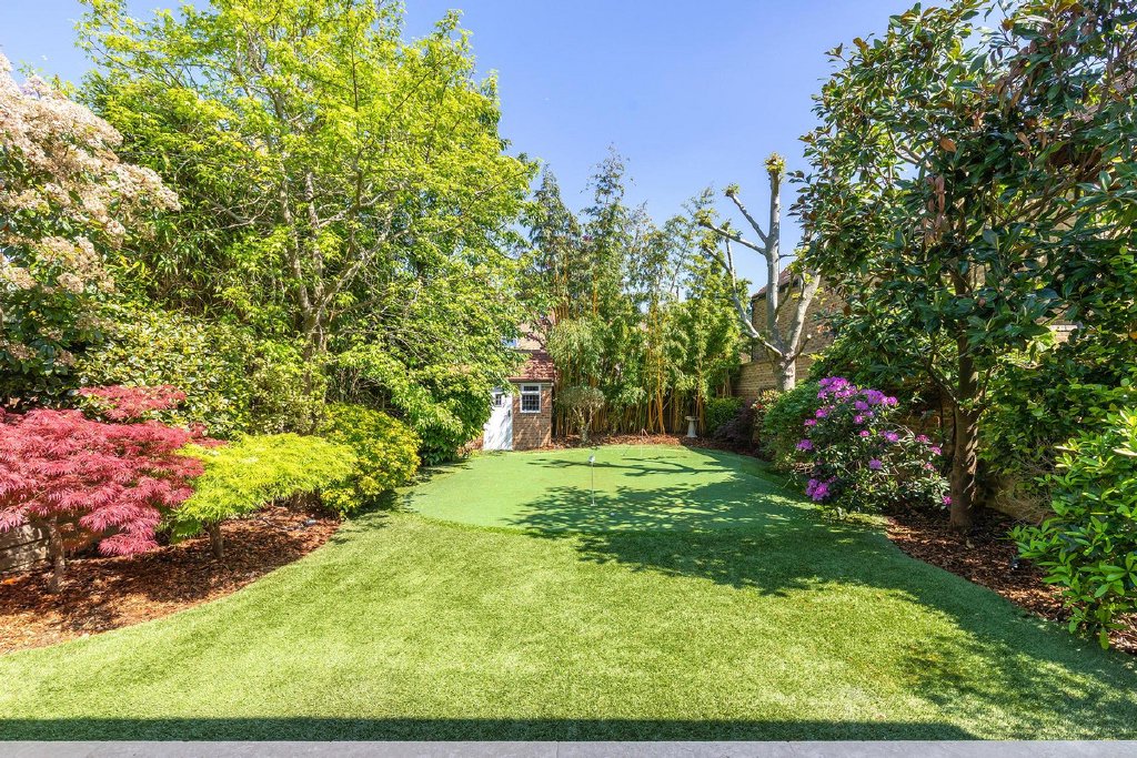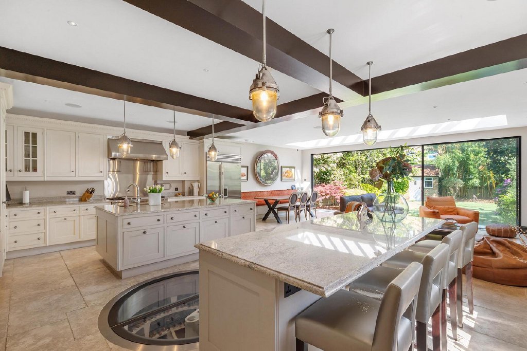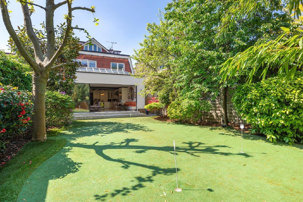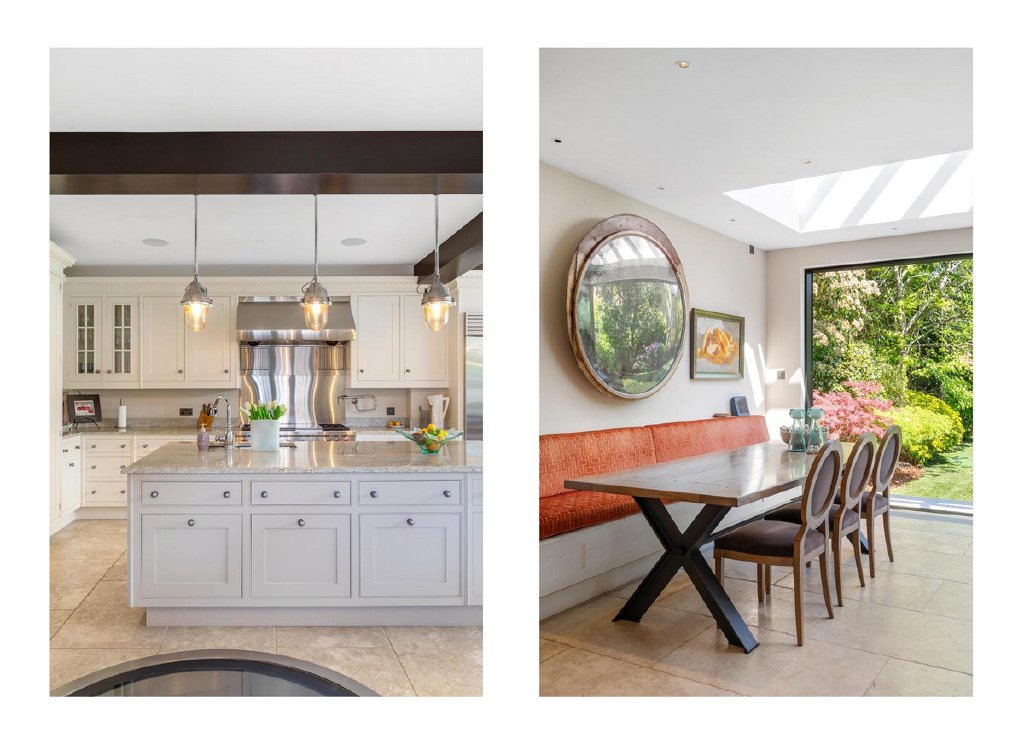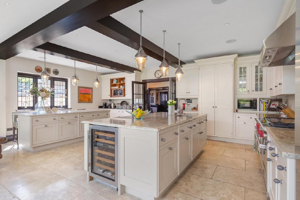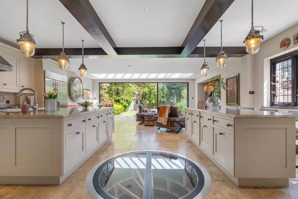 Upon entering, you are greeted by the inviting warmth of the home, accentuated by its captivating character. You have a separate reception room with original feature fireplace and original wood paneling, stepping into the kitchen, its clear this really is the heart of the home, as you're met with a tastefully extended space featuring not one, but two kitchen islands, offering both functionality and style. The pièce de résistance is undoubtedly the sunken wine cellar, a unique focal point that is sure to spark conversation among guests. Overlooking the meticulously manicured 60ft garden, complete with its very own putting green, ideal for those keen golfers, the kitchen seamlessly flows into a dining area and reception space, perfect for hosting gatherings with ease.