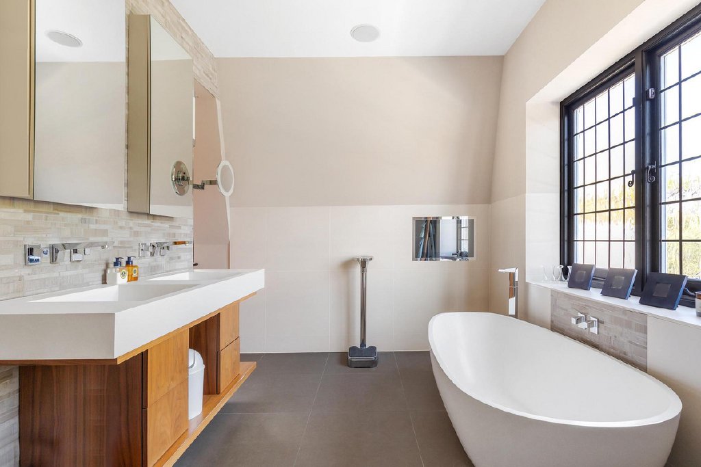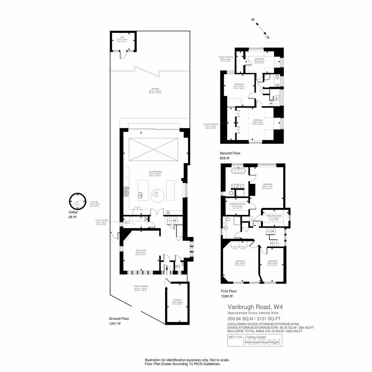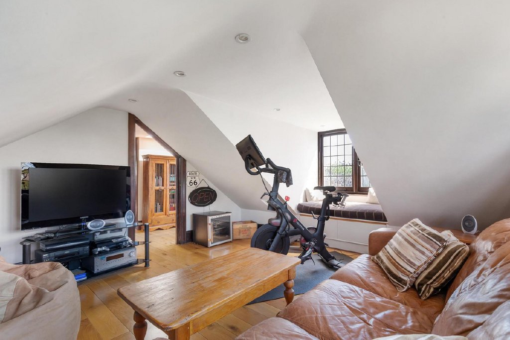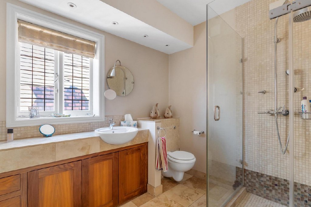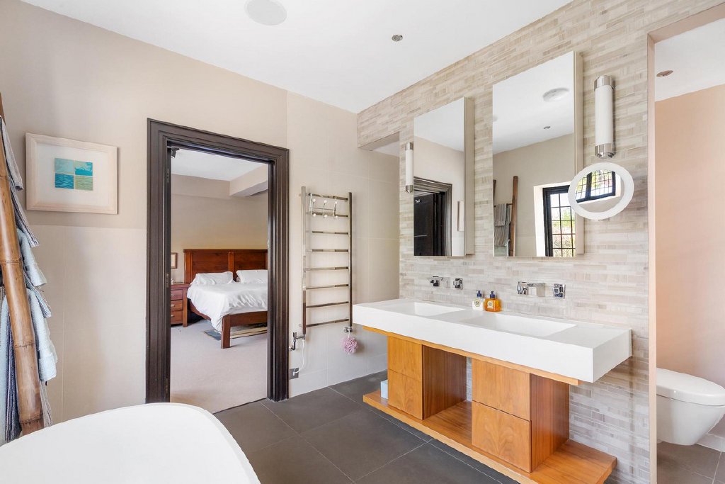 The first floor hosts three bedrooms, including the luxurious principal room boasting his and hers walk-in wardrobes and an opulent en suite bathroom. Upstairs, the top floor reveals three additional bedrooms, bathed in natural light and offering ample storage space, including built-in wardrobes and eave storage.